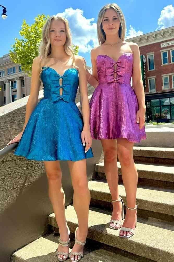 Jalise | Glitter Strapless Peacock Short Homecoming Dress with Bow