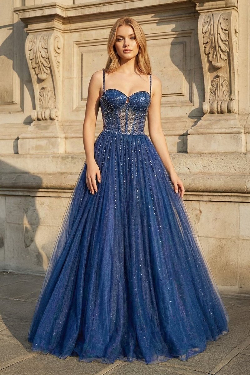 Graceful and enchanting, this spaghetti-strap A-line prom dress is crafted from layers of soft tulle, flowing elegantly into a sweep train. The sweetheart neckline and illusion corset bodice create a flattering silhouette, while delicate appliqués add subtle sparkle and texture. Finished with a lace-up back for an adjustable fit, this blue gown is perfect for prom, formal evenings, or any occasion.