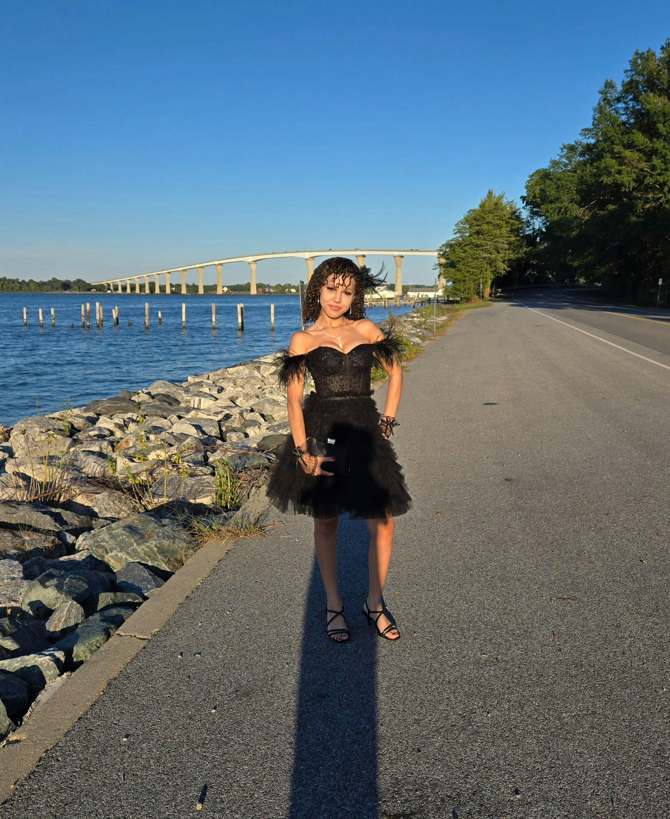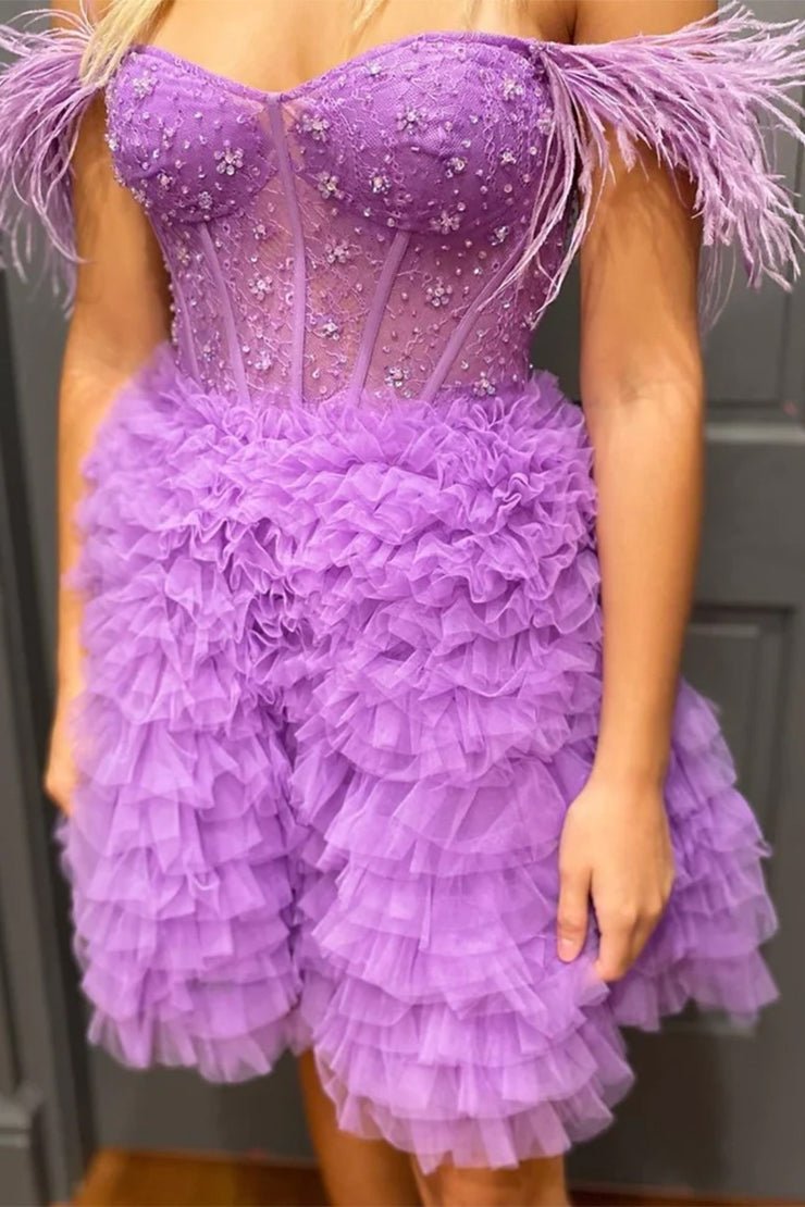 The Olivia dress from KissProm, A-line Off-the-Shoulder Light Blue Short Homecoming Dress is a symphony of texture and style. Crafted with a delicate blend of lace and tulle fabric, this dress is all about the finer details. The semi-sweetheart neckline adds a touch of charm, while the off-the-shoulder straps offer a sophisticated allure. The ruffles and beadings scattered throughout the dress add to its overall elegance. However, the spotlight is stolen by the extravagant feather embellishment that adds a unique twist to the traditional homecoming dress.