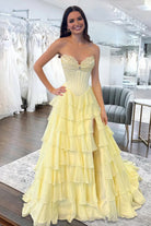 Allinia is a dreamy choice for a night full of elegance and charm. Her flowing A-line silhouette in lightweight chiffon drapes gracefully, creating a romantic and flattering shape. The sweetheart neckline frames the shoulders beautifully, while the lace-up back ensures a perfectly contoured fit. Delicate ruffles and beading add texture and sparkle, complemented by subtle lace detailing and a soft slit that gives movement with every step. Ideal for prom nights or special formal events, Allinia captures both grace, standing out among formal dresses and evening dresses with effortless beauty.