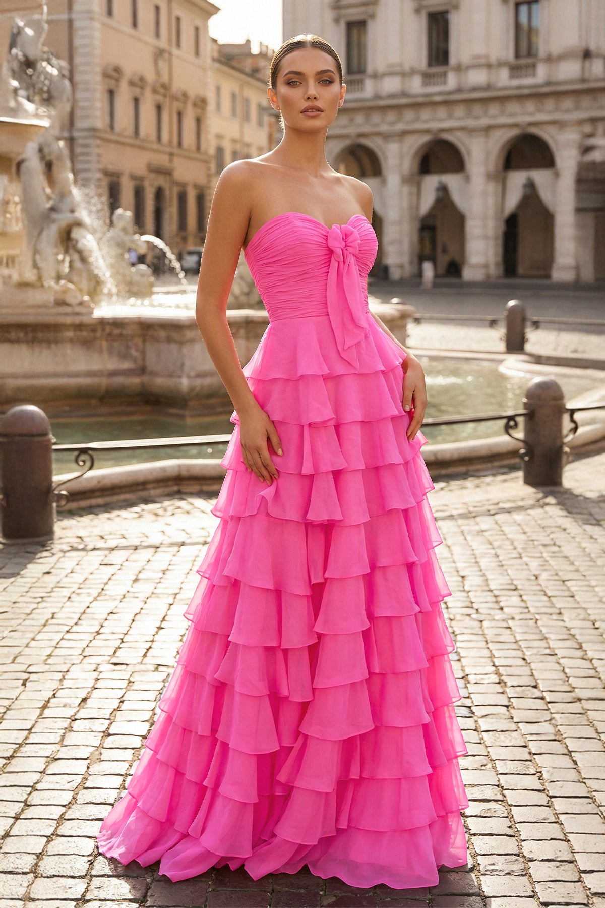 Elevate your evening look with the Chiffon Fuchsia Sweetheart Tiered Ruffles Prom Dress with Slit, a stunning choice for both evening dresses and formal dresses. The dress features a flattering A-line silhouette that flows effortlessly to the floor, creating an elegant and graceful appearance. Made from soft, airy chiffon, this dress ensures both comfort and style, making it perfect for long evenings and special occasions. The sweetheart neckline adds a romantic and feminine touch, while the sleeveless design gives a modern, chic vibe. The dress is beautifully embellished with tiered ruffles that add texture and dimension, enhancing its dramatic flair. A daring slit on the side provides a touch of boldness and ensures ease of movement, making this dress both eye-catching and practical. Available in vibrant shades of fuchsia, yellow, sky blue, candy pink, and orange, this dress offers a range of colors to suit your personal style.