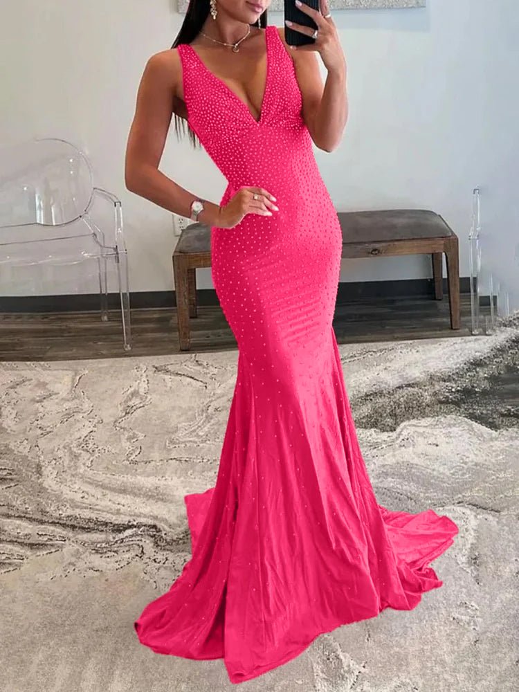 Turn every head as you make your entrance in Molly—a mermaid-style masterpiece of beaded satin in transcendent white or alluring green. The deep V-neckline plunges gracefully, drawing eyes to the artfully pleated bust. Daring and demure, the open back adds an element of surprise, complete with a seamless zipper. As a formal dress, Molly perfectly balances sophistication with allure, making you the center of attention at any event. The gown hugs your curves before flaring into a court train, making your every move a statement of elegance and grace. In Molly, you’re not just attending the event; you’re stealing the show, embodying the essence of evening dresses that leave a lasting impression.
