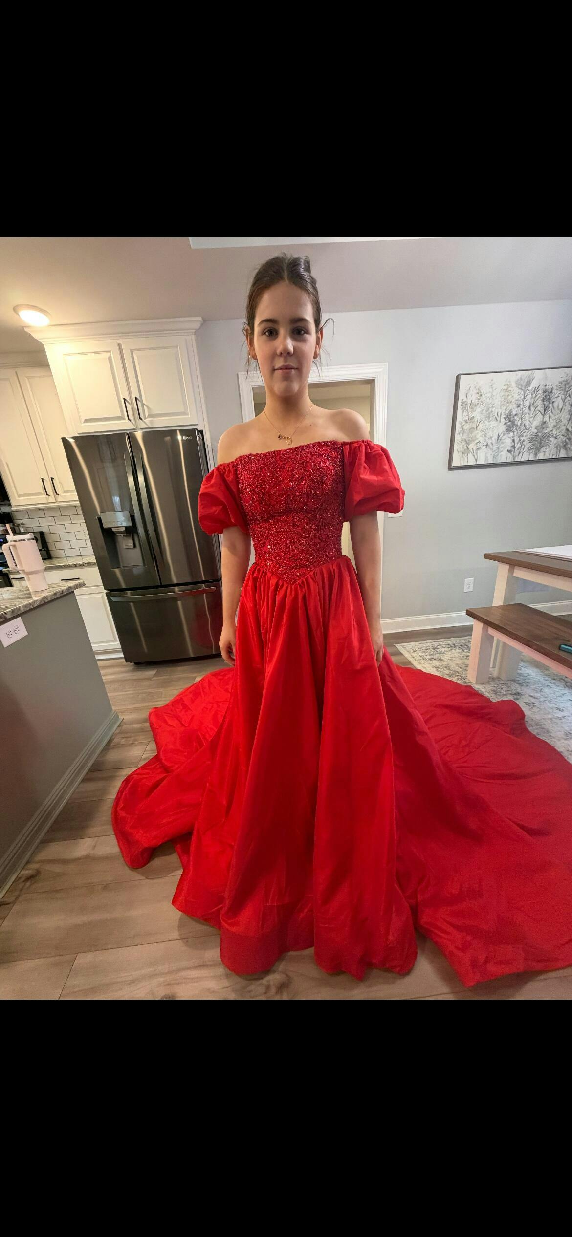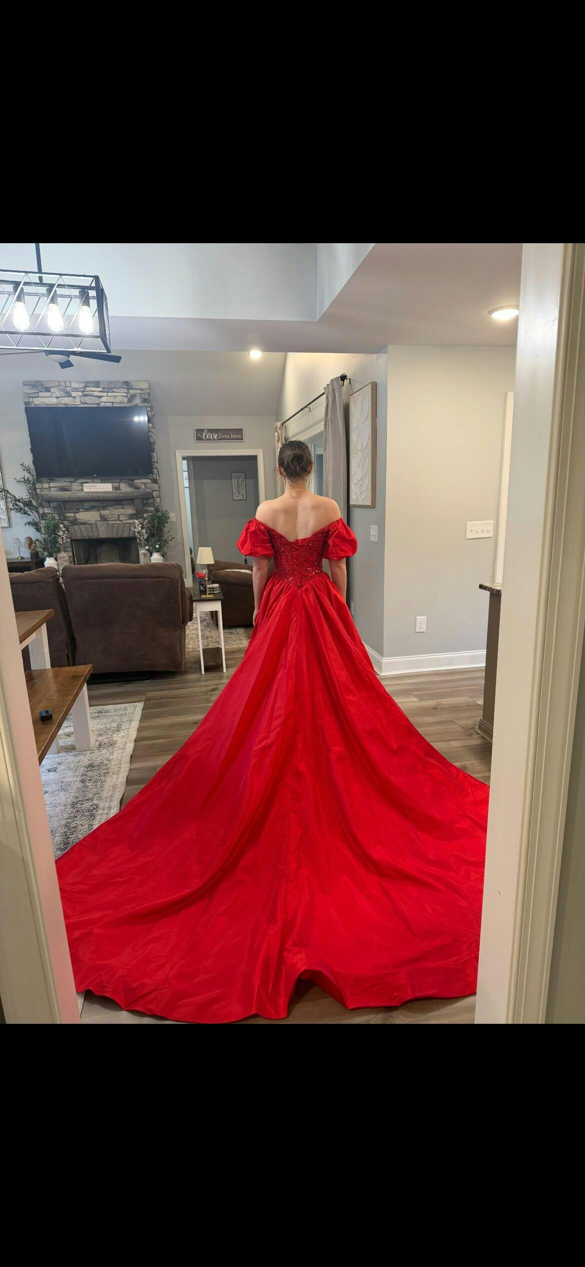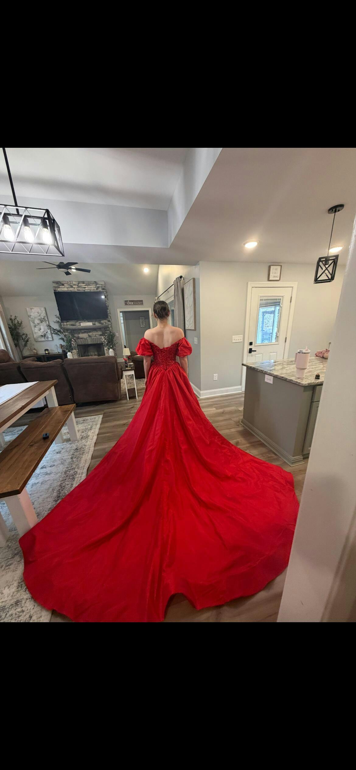Meet "Liana," a declaration of regal beauty. Radiating in an opulent red, this A-line marvel is crafted meticulously from lavish taffeta fabric, promising not just a stunning appearance but an exquisite feel. The off-the-shoulder neckline gives way to ethereal short puffy sleeves, channeling timeless elegance and modern sophistication simultaneously. As your gaze trails down, the beaded bodice captures the light. But Liana's allure doesn't stop there; a daring slit adds a sultry twist to this elegant ensemble, ensuring all eyes remain on you. Finished with a zipper back and cathedral train, Liana seamlessly combines classic charm with contemporary flair, making it the ultimate choice for both evening dresses and formal dresses, ensuring you leave an everlasting impression.