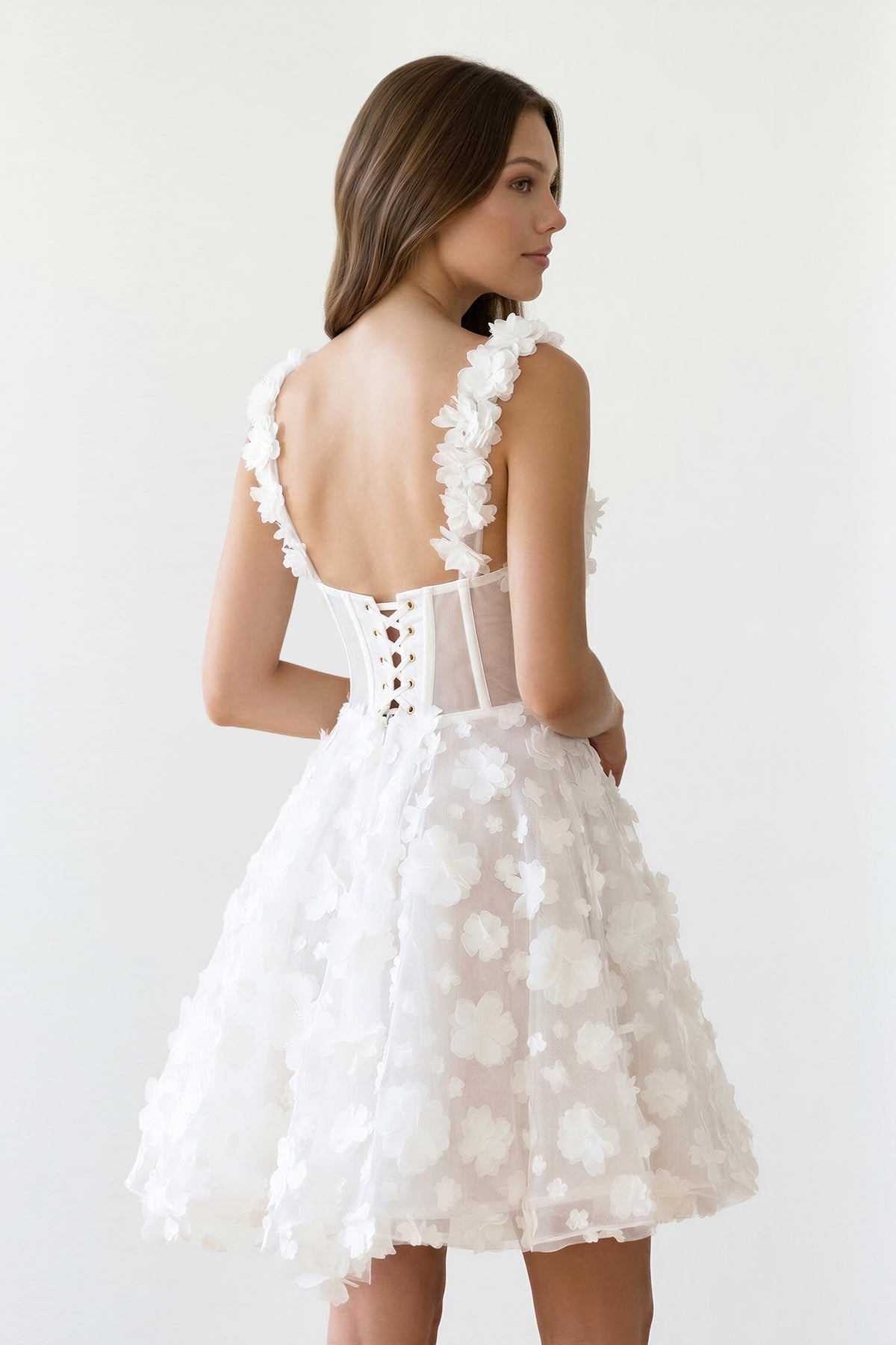Romantic and delicately detailed, this ivory mini dress is designed to highlight your feminine charm with a soft, elegant touch. Featuring a flattering A-line silhouette, it cinches at the waist and flows into a light, graceful shape. The sweetheart neckline enhances the neckline with a romantic feel, while the corset bodice provides structure and a flattering fit. Intricate appliqued lace embellishments add texture and refined detail, elevating the overall look. Crafted from lace fabric, it offers a light, airy feel with timeless sophistication. The lace-up back ensures a customizable and secure fit. Perfect for graduation, parties, or special occasions, this dress blends elegance with delicate beauty.