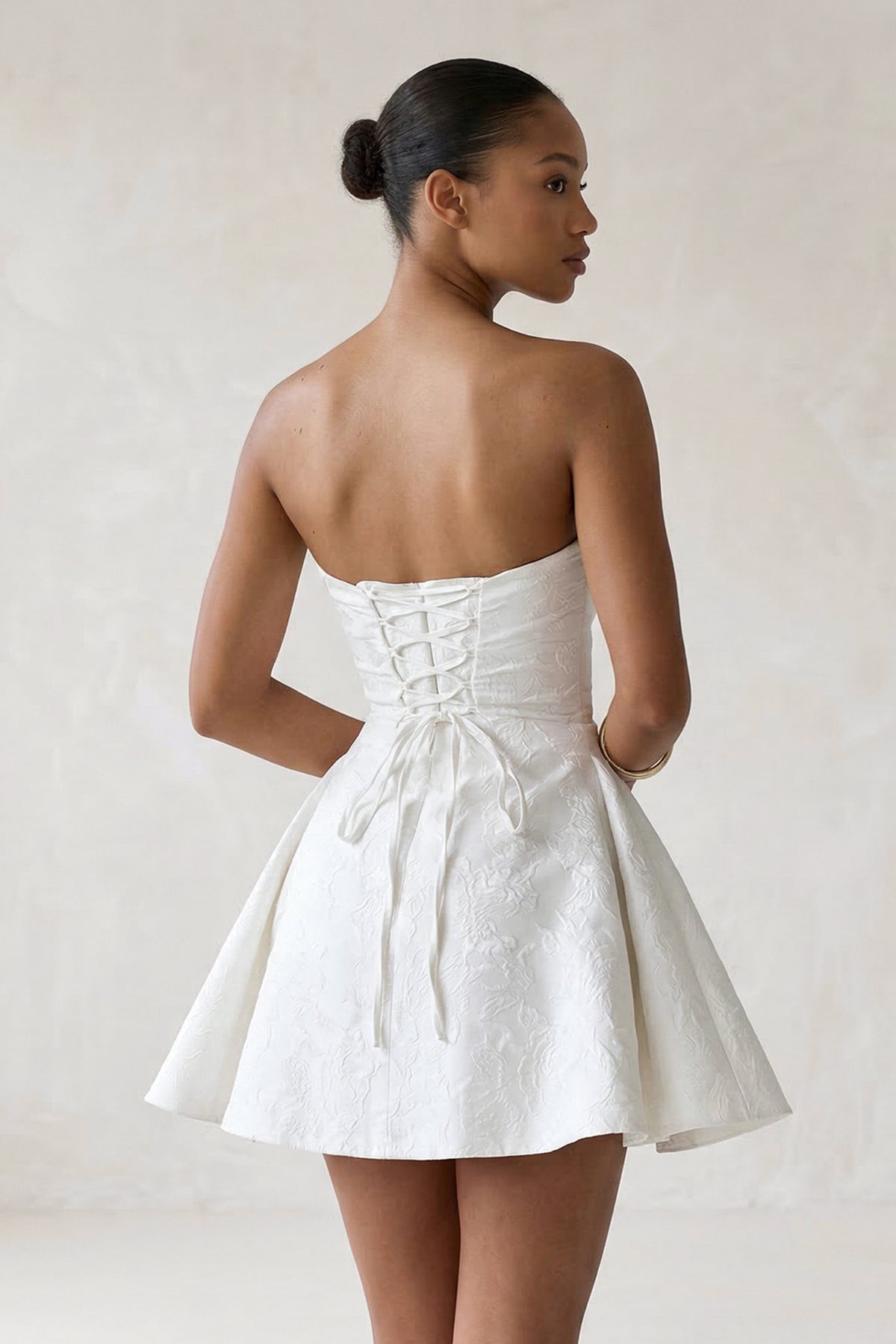 Romantic and refined, this ivory mini dress is designed to highlight your feminine charm with elegant detail. Featuring a flattering A-line silhouette, it cinches at the waist and flows into a soft, flared shape. The plunging V neckline enhances the neckline with a bold yet graceful touch, while the jacquard fabric adds rich texture and dimension. Crafted for both structure and style, it offers a polished, elevated finish. The lace-up back ensures a customizable and secure fit. Perfect for graduation, parties, or special occasions, this dress blends classic elegance with a modern, eye-catching edge.