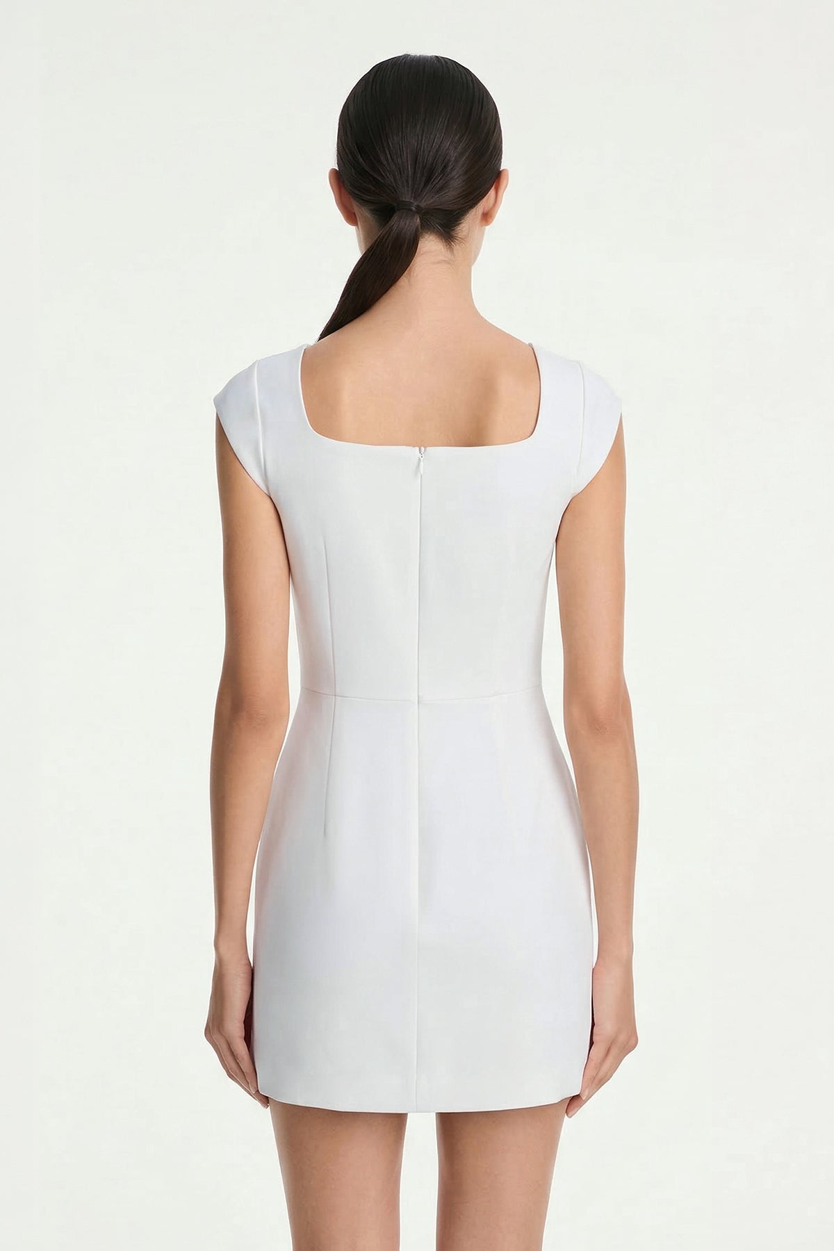 Clean and refined, this white mini dress is designed to highlight your silhouette with effortless elegance. Featuring a sleek sheath silhouette, it contours the body for a flattering, streamlined fit. The square neckline adds a structured, modern touch, while the tailored slim-fit design enhances your natural shape. Crafted from crepe fabric, it offers a smooth, structured feel with a polished finish. The zipper back ensures a secure and comfortable fit. Perfect for graduation, parties, or evening events, this dress blends minimalism with timeless sophistication.