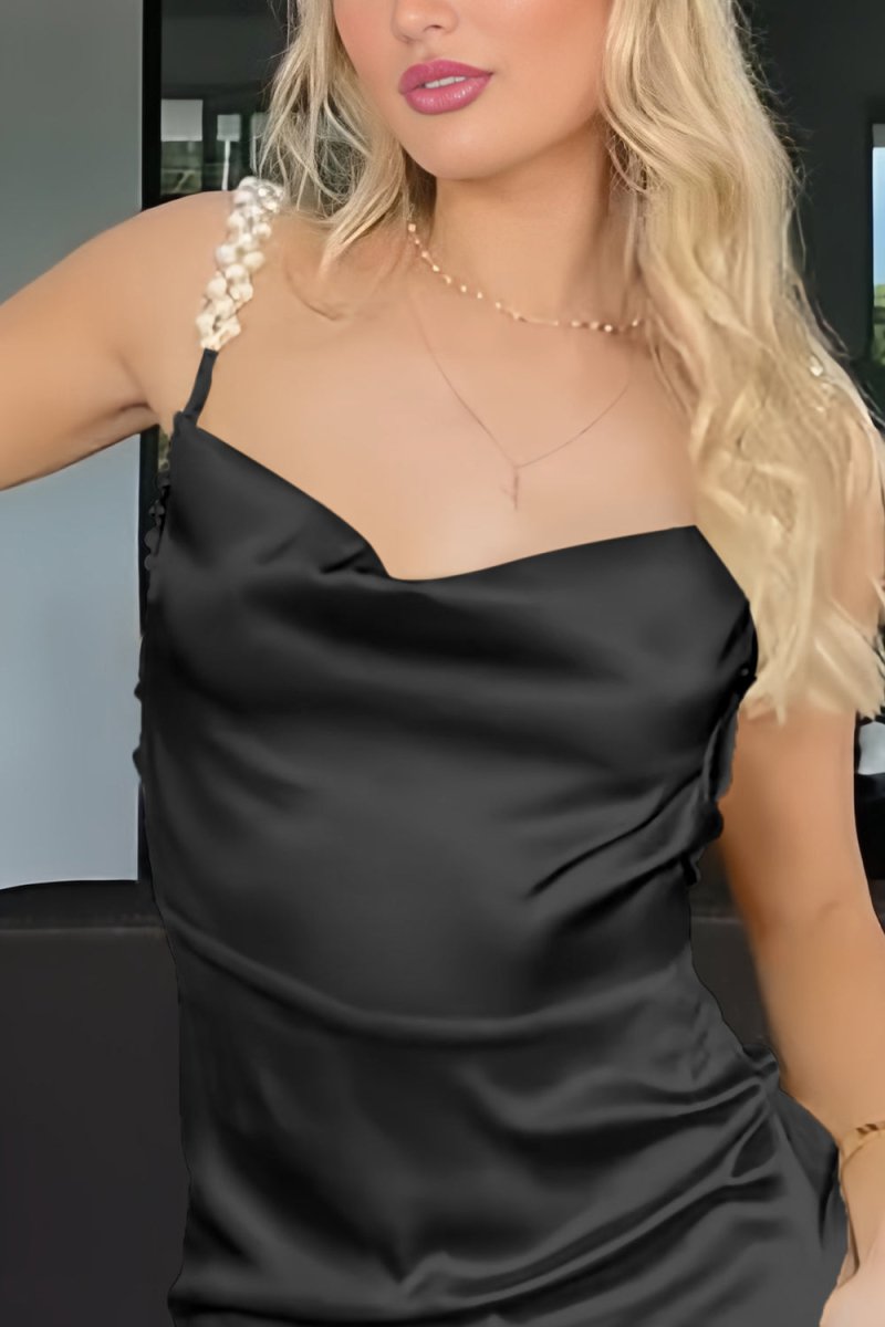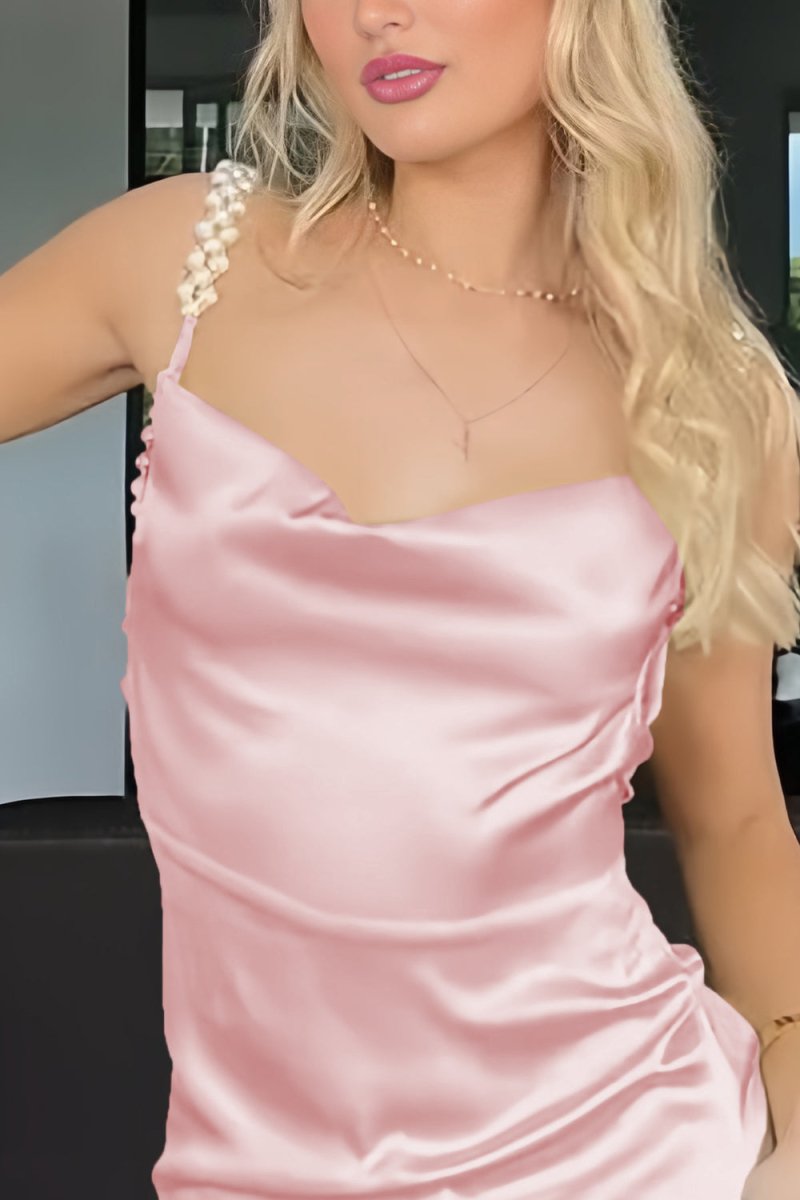 Chic and modern, Caeli shines in our evening dresses collection. Crafted from smooth satin, her sheath silhouette gracefully skims the body, enhanced by slender spaghetti straps and a subtle cutout detail for added allure. The backless design combines a comfort with elegance. Ideal for prom nights or any formal celebrations, Caeli stands out among formal dresses with her contemporary style and refined sophistication.