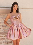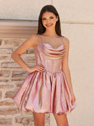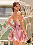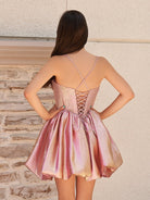 Briala | Pink - A Line Metallic Jacquard Scoop Neck Corset Short Homecoming Dresses