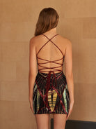 Shine bright in every spotlight with this stunning sheath-style cocktail party dress. Crafted from dazzling sequined fabric in a sleek black hue, this mini-length dress features a flattering V neckline, sleeveless design, and shimmering sequined straps that add just the right amount of sparkle. The fitted silhouette beautifully contours your figure, while the lace-up back offers both a stylish touch and an adjustable fit. Perfect for cocktail parties, holiday celebrations, bachelorette nights, or any special evening where you want to turn heads with confidence and glamour.