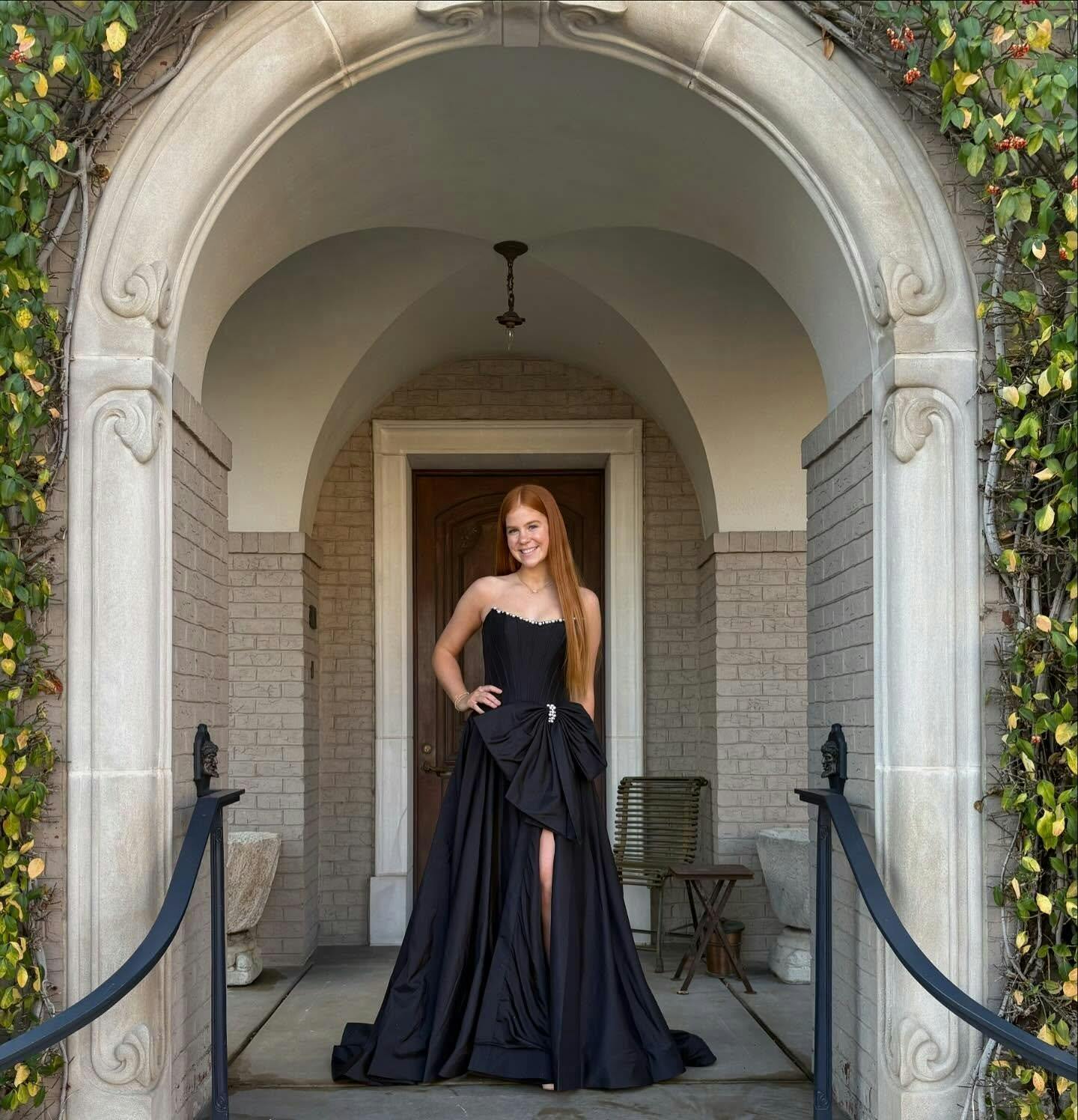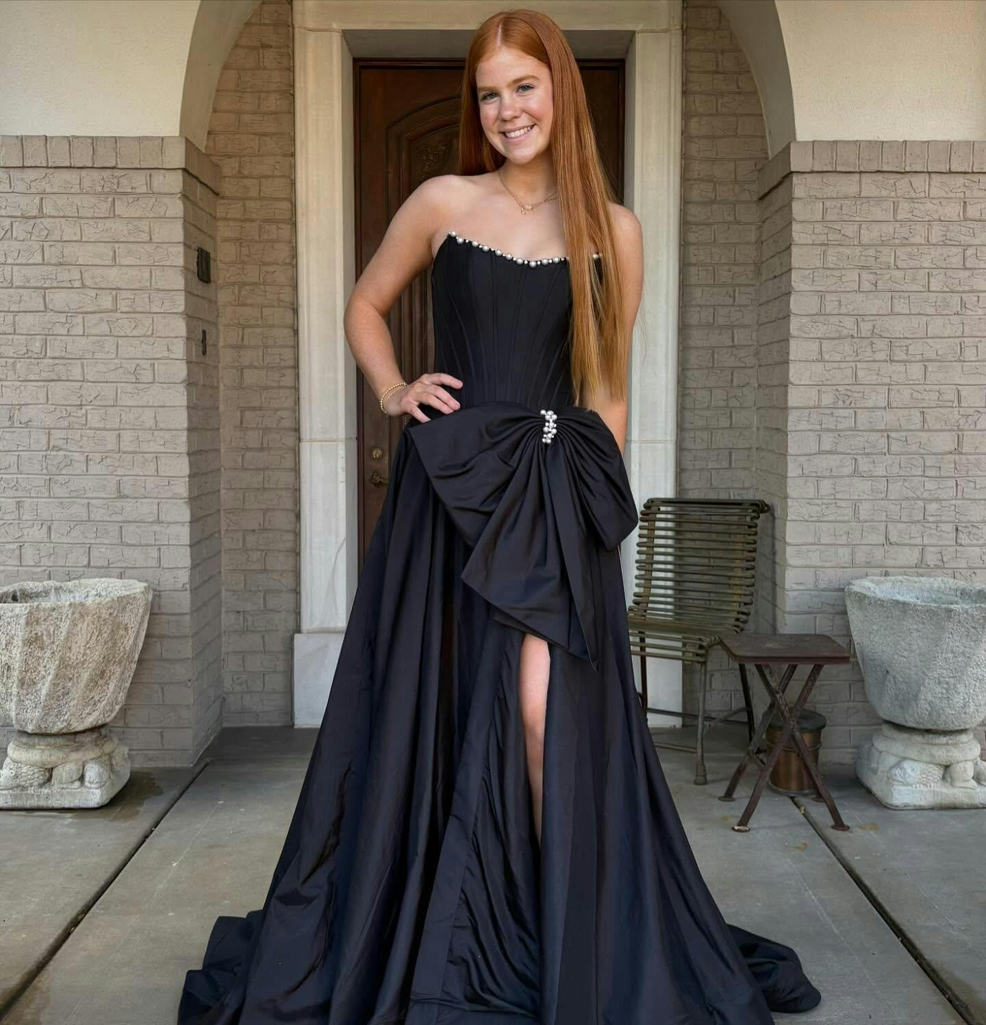 Embrace timeless elegance in this pink A-line dress crafted from smooth satin. The strapless neckline highlights the shoulders, while the sleeveless design keeps the look sleek and modern. Pearl accents and a delicate bowknot add refined charm, complemented by a subtle slit for graceful movement. A lace-up back ensures a perfect, adjustable fit. Ideal for prom nights, gala evenings, or special celebrations, this dress combines classic sophistication with contemporary style, making it a standout among formal dresses and evening dresses.