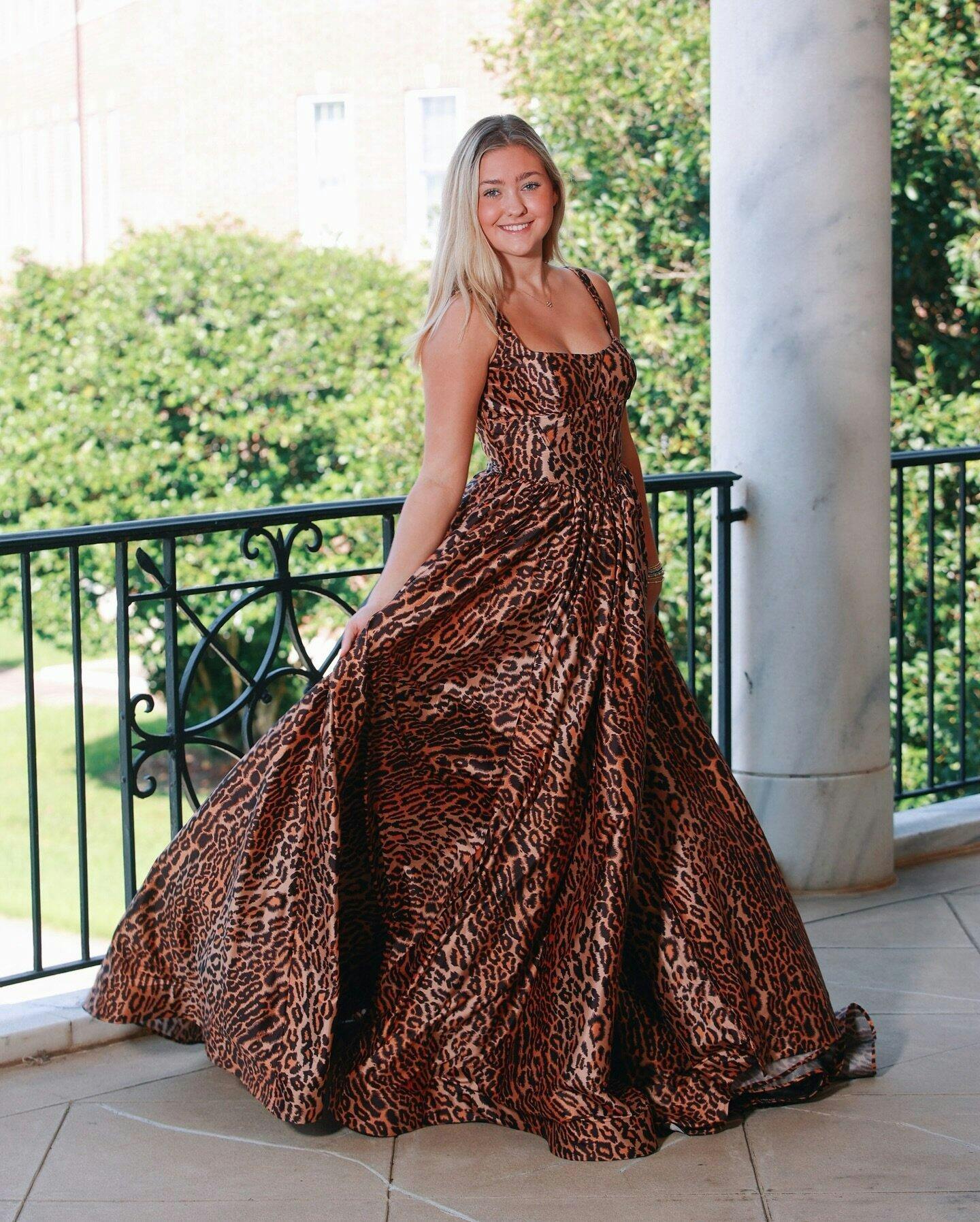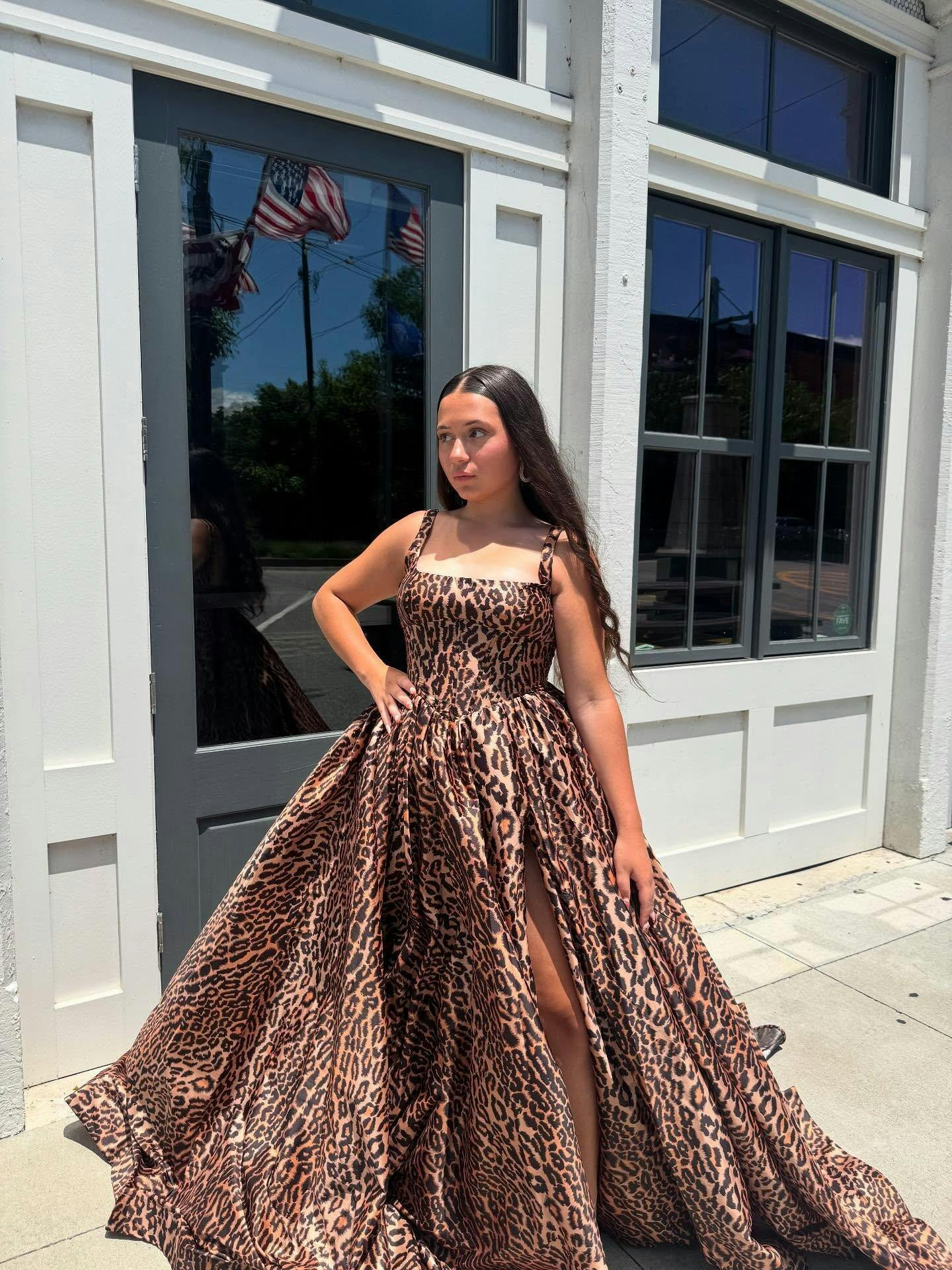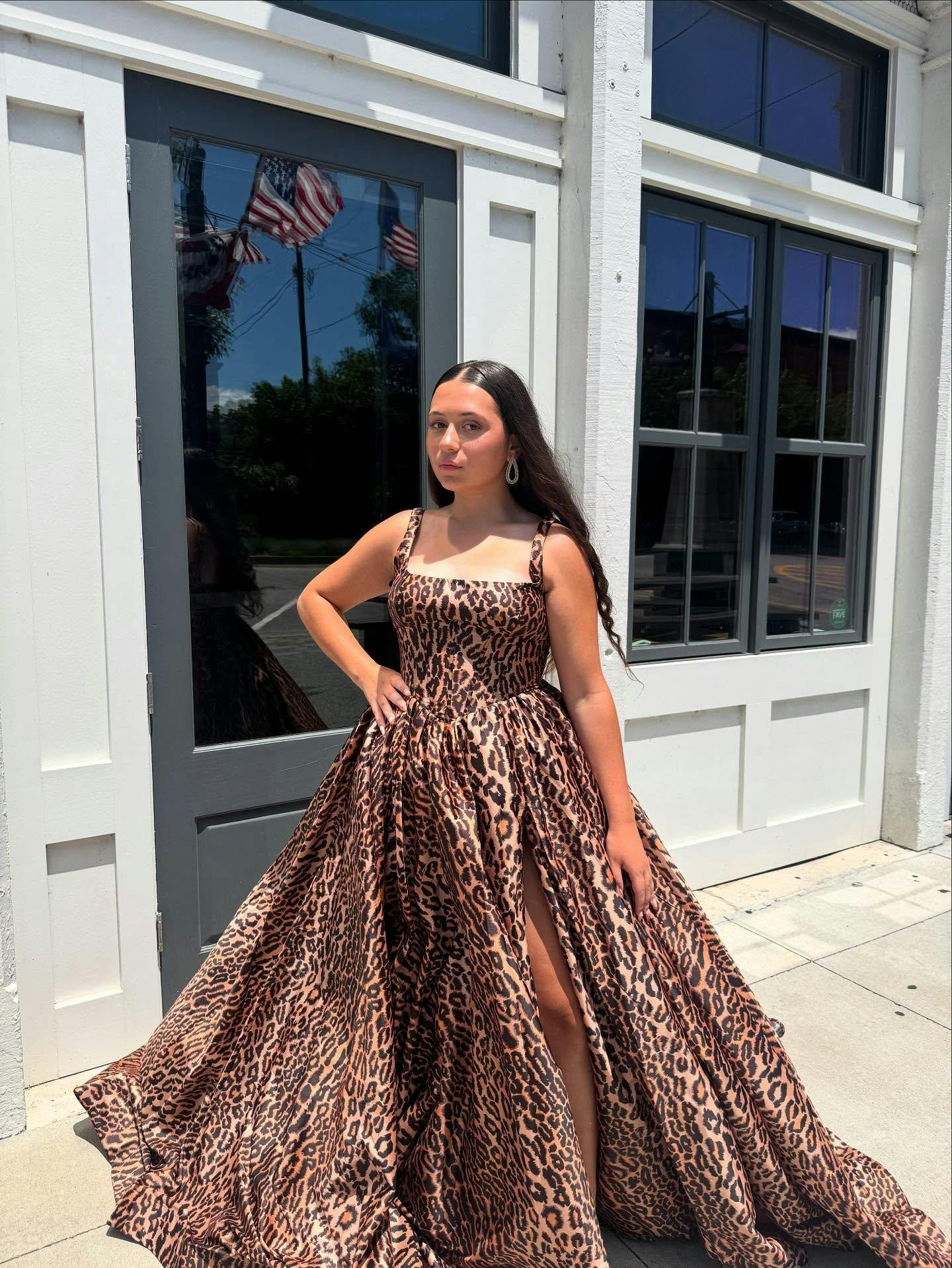 Make a bold statement at your next special event with the Dazira Leopard Satin A-Line Dress. This floor-length gown is crafted from luxurious satin, features a sophisticated square neckline and a sleeveless design that perfectly complements the elegant A-line silhouette. The lace-up back ensures a customized fit, while the daring slit adds a touch of allure and movement. This leopard-print gown combines daring style with classic elegance, ideal for evening dresses or formal occasions.