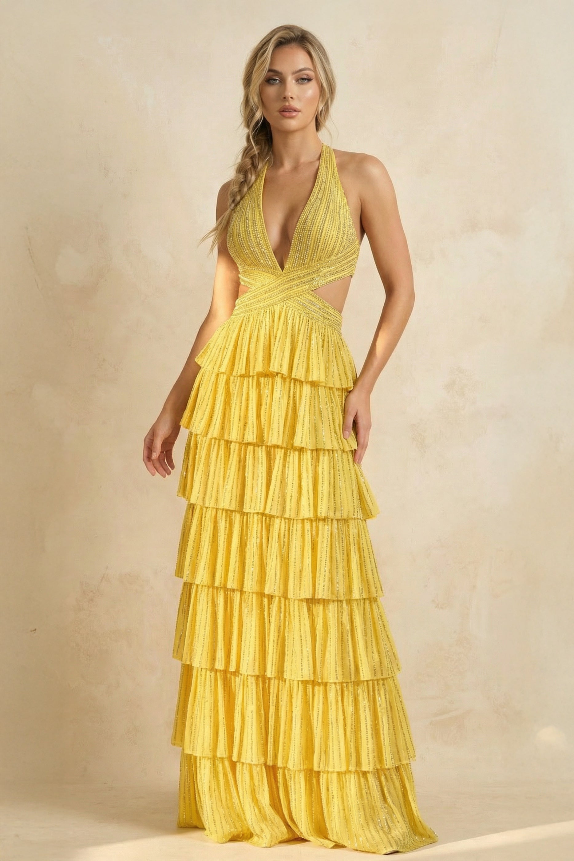 • Yellow - A-Line Halter Satin Beaded Long Prom Dresses With Ruffles