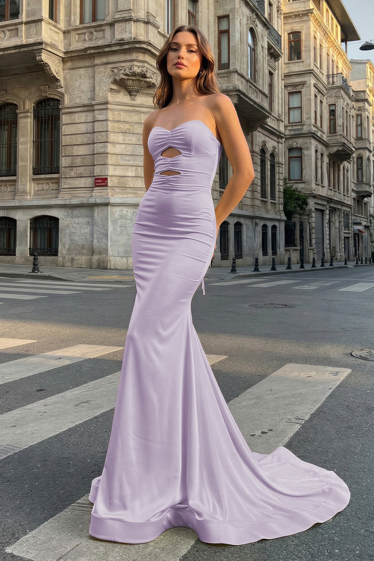 Turn heads in this strapless mermaid gown crafted from luxurious satin, designed to hug your curves and flow gracefully into a sweep train. The sleeveless cut highlights your shoulders, while the daring cutout detailing and lace-up back add a modern, flirty twist. Available in vivid shades of yellow, pink, green, and black, this dress blends bold color with elegant silhouette, perfect for prom, gala evenings, or any formal event where you want to shine with confidence and style.