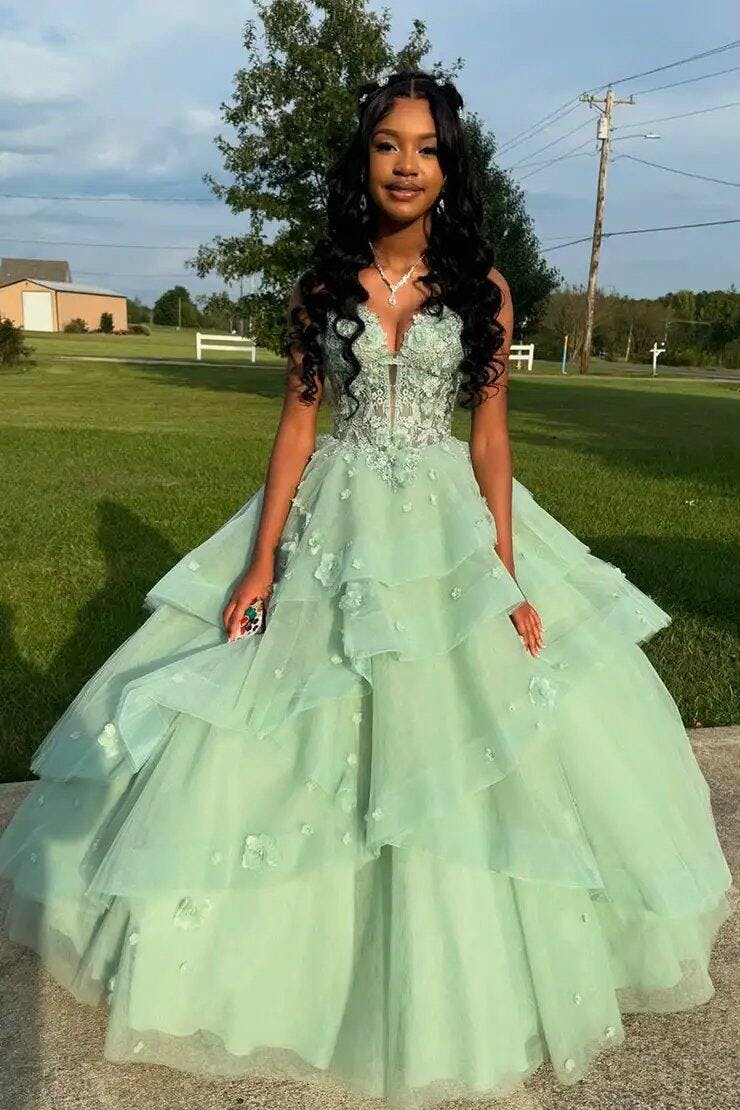 Embrace your inner princess in the Cute Ball Gown Sweetheart Sage Green Tulle Long Prom Dress. Azurena dress is a perfect choice for both evening dresses and formal dresses, with its classic ball gown silhouette that creates a voluminous and dreamy look. It is made from luxurious tulle, and the soft sage color adds a refreshing and sophisticated touch, making it an ideal choice for any formal occasion. The charming spaghetti straps neckline beautifully frames your face and neckline, while the sleeveless design adds a touch of elegance and comfort. The delicate appliques adorn the dress, adding intricate detail and a romantic flair to the overall design. The lace-up back allows for a customizable fit, ensuring you feel secure and confident throughout the evening. Step into this stunning gown and let your elegance take center stage!