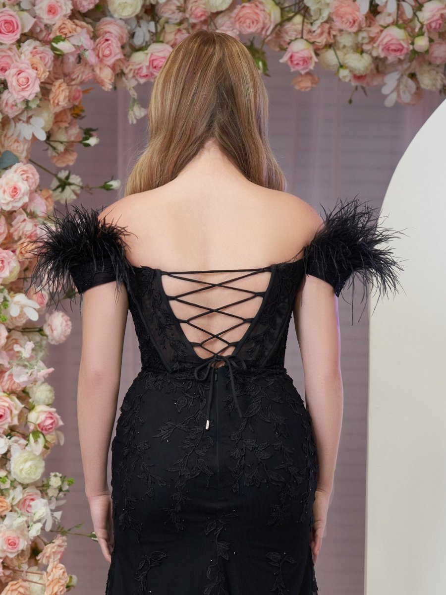 Steal the spotlight in Elaina, our Mermaid Deep V-Neck Feather Lace Long Prom Dress. This floor-length marvel is crafted from luxurious beaded tulle fabric, adorned with intricate lace appliques that bring an ethereal touch. An ideal choice for evening dresses and formal dresses, with its plunging V-neckline adds a sultry allure, perfectly balanced by the feathered off-the-shoulder straps that epitomize femininity. As you make your way through the room, the sweep train trails gracefully behind you, adding a final touch of drama. And when it's time to strut your stuff? The thigh-high slit ensures you do so with irresistible allure.