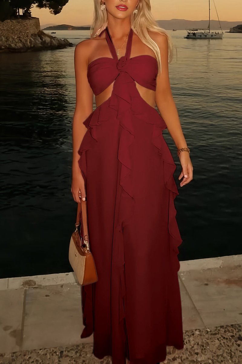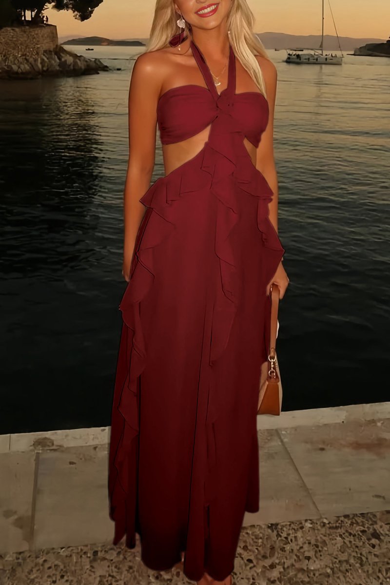 Crisia | Slate Blue - A-Line Halter Chiffon Ruffled Long Prom Dresses With Cut Out