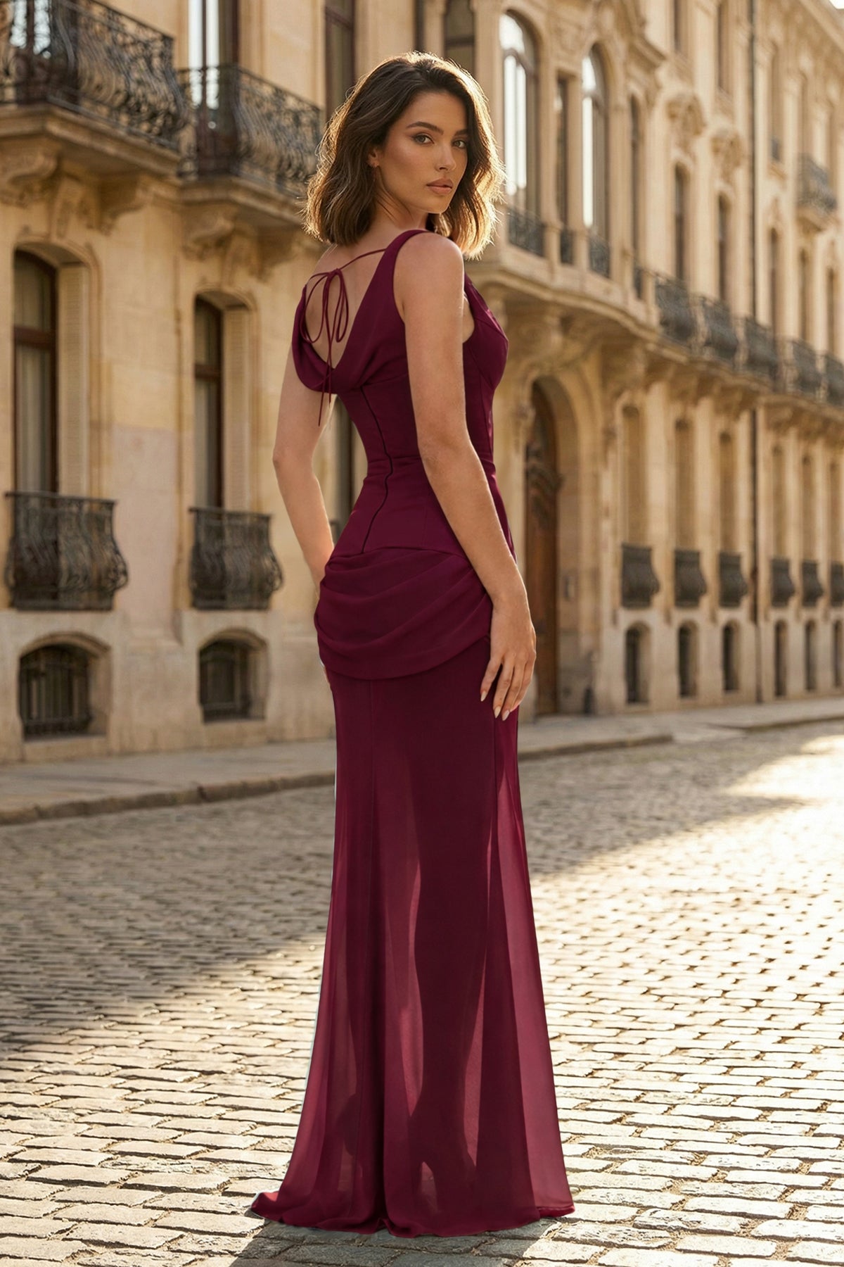 Make a graceful entrance in this sky blue sheath dress crafted from soft chiffon. The one-shoulder neckline adds a modern, asymmetrical touch, while the sleeveless cut keeps the look sleek. Pleated detailing enhances texture and movement, and the open back introduces an elegant, alluring finish. Ideal for prom nights, gala events, or evening celebrations, this dress combines refined sophistication with contemporary style, standing out among formal dresses and evening dresses.