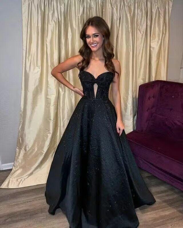 Make an unforgettable entrance with the Elya Strapless Satin Beaded A-Line Prom Dress, a timeless piece perfect for evening dresses and formal dresses collections. Designed with a flattering A-line silhouette, this gown flows effortlessly to the floor for an elegant and graceful look. The satin fabric gives a smooth, lustrous finish, while the delicate beadwork adds just the right amount of sparkle. The strapless neckline beautifully highlights your shoulders, and the charming bow detail completes the feminine and sophisticated style. Whether you’re attending prom, a gala, or a formal event, the Elya dress ensures you shine with elegance and confidence all night long.