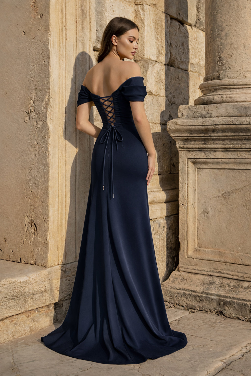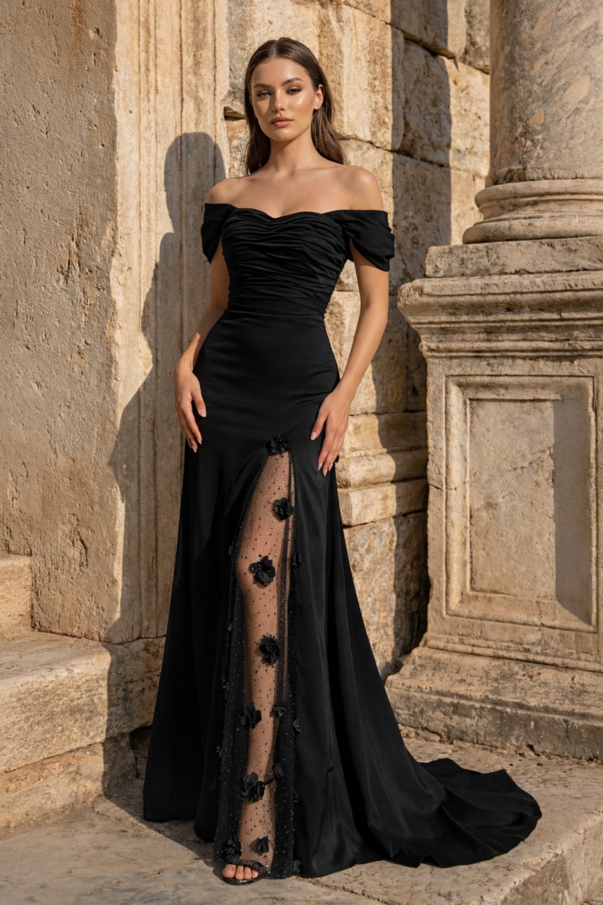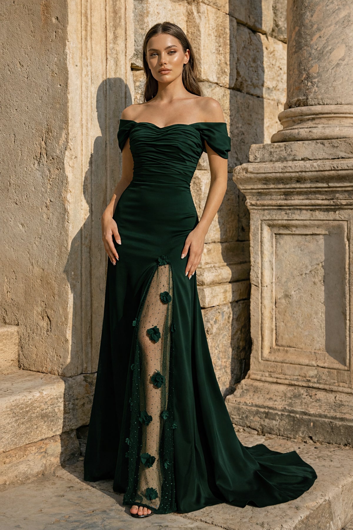 Genira is a radiant choice from our evening dresses collection, perfect for making a memorable entrance. Her figure-hugging mermaid silhouette in smooth satin is adorned with delicate flowers and sparkling sequins, adding both elegance and charm. The romantic off-the-shoulder neckline and zipper back ensure a flattering, comfortable fit, while a subtle slit adds movement and grace. Ideal for prom nights or formal occasions, Genira shines among formal dresses with her cheerful and sophisticated style.