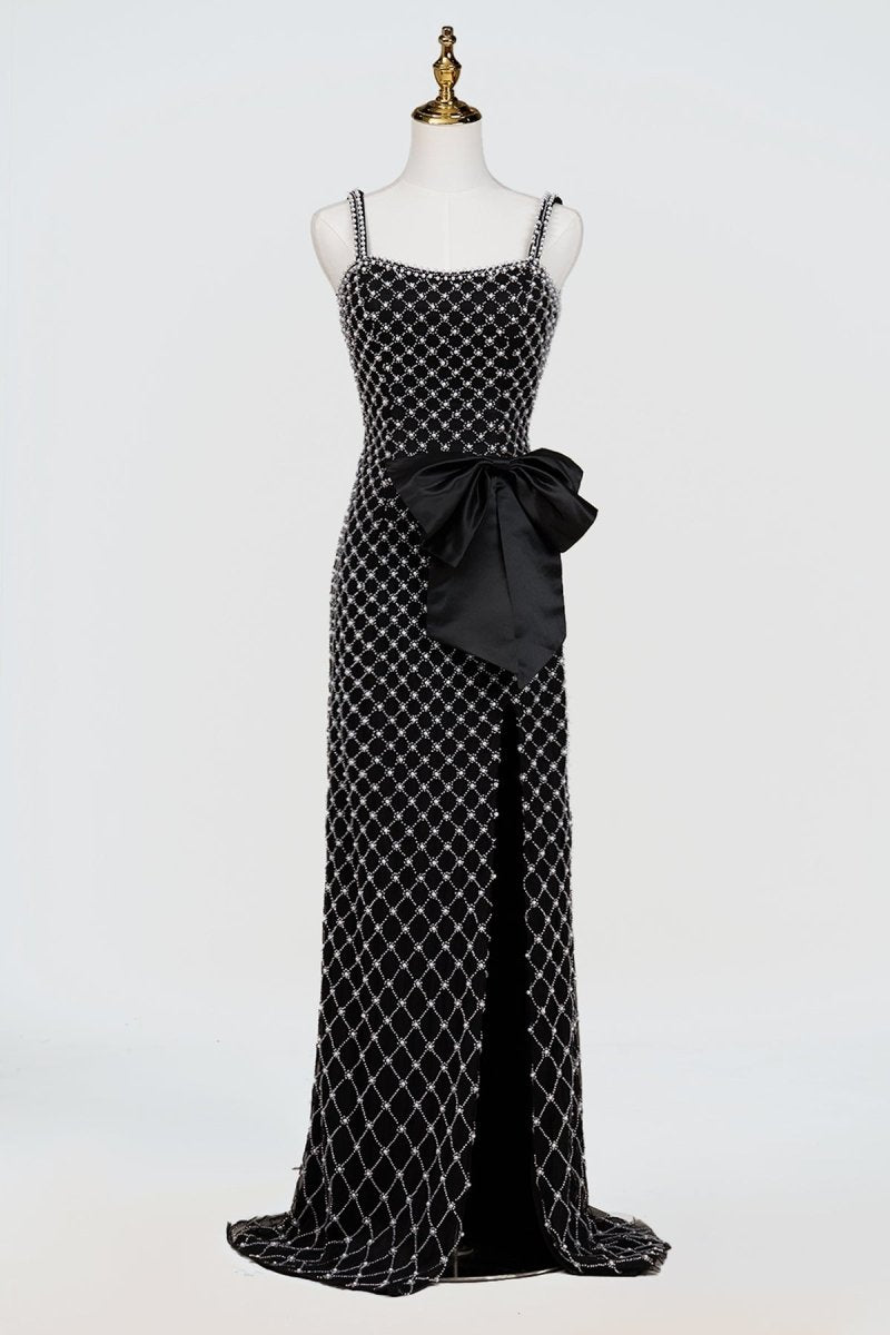 Black Spaghetti Straps Sheath Satin Beaded Formal Prom Dresses With Bowknot