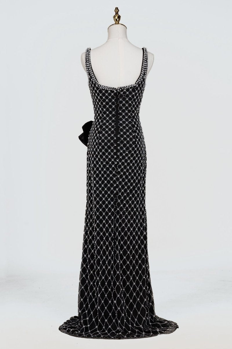 • Mirielle | Black - Spaghetti Straps Sheath Satin Beaded Formal Prom Dresses With Bowknot - KissProm