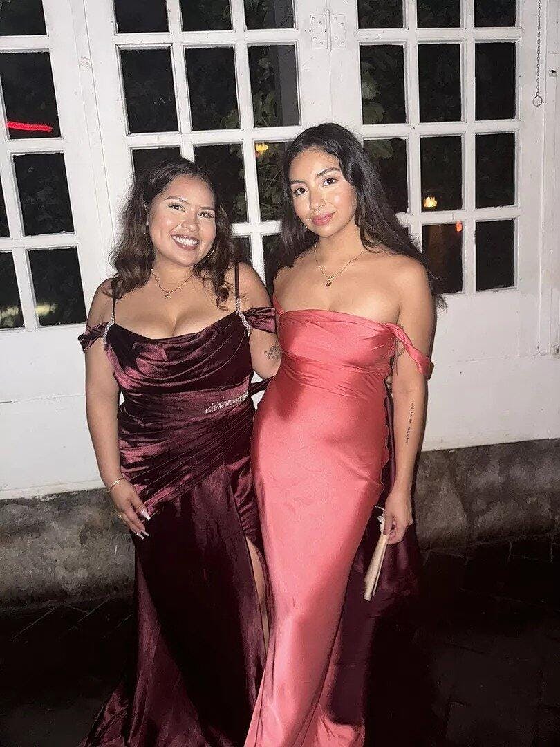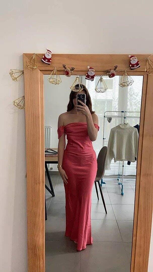 • Marquina | Off the Shoulder Coral Mermaid Satin Long Party Dress
