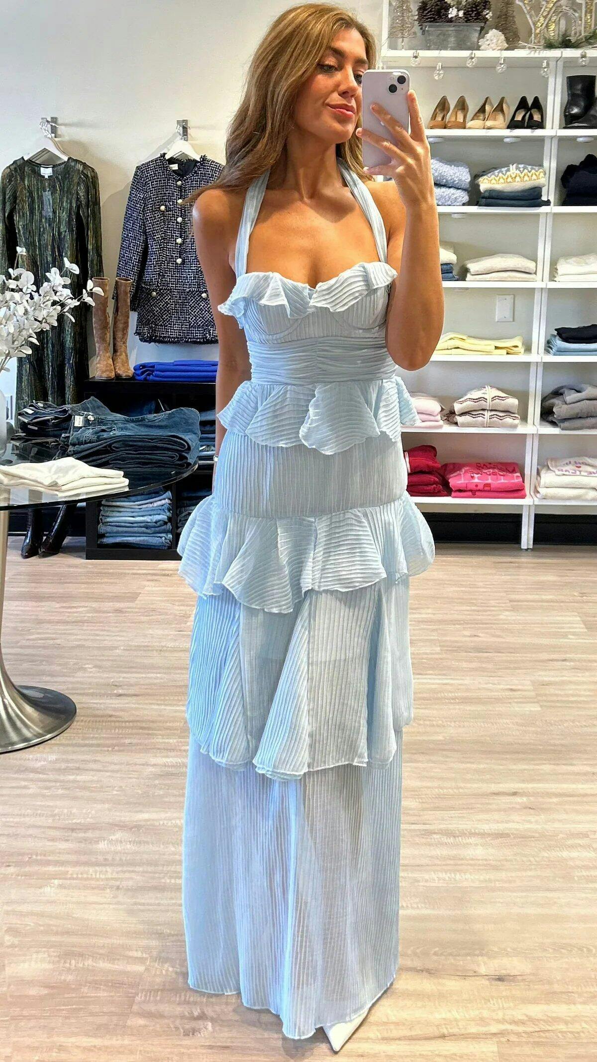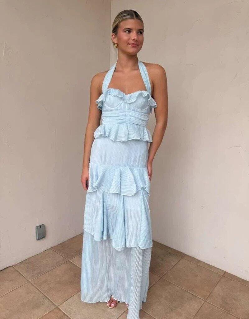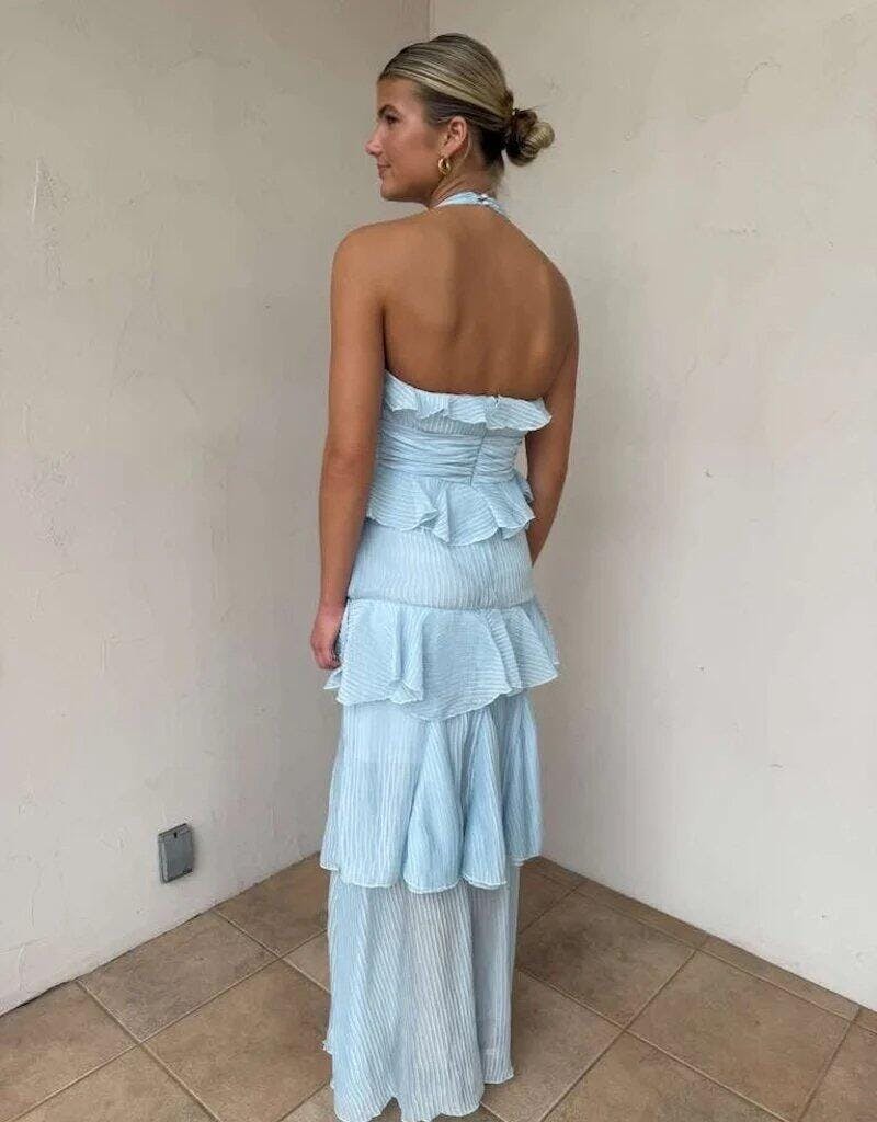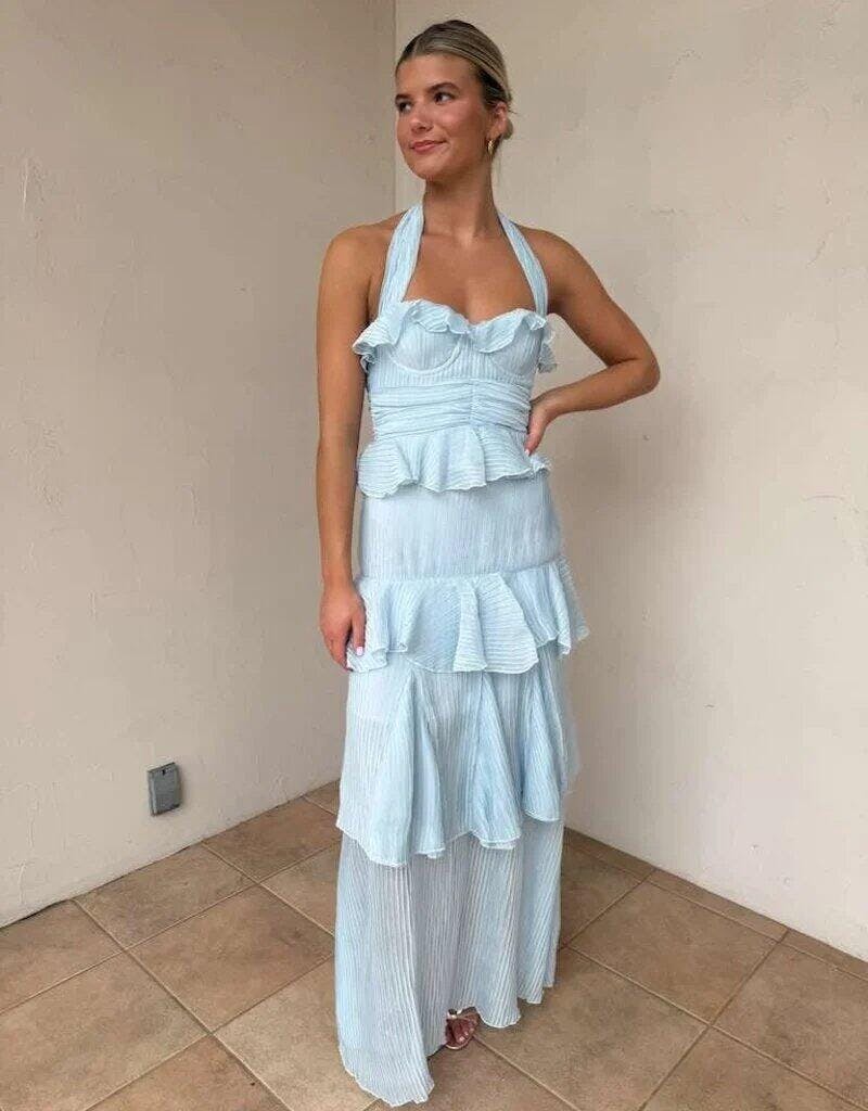The Ozen Sky Blue Halter Sheath Pleated Chiffon Prom Dress is the definition of romantic elegance. Crafted from delicate chiffon fabric, this gown features fine pleats that add texture and movement, while the cascading ruffles bring a touch of playful charm. The halter neckline frames the shoulders beautifully, and the sheath silhouette gently outlines your figure for a sleek, feminine shape. Finished with a zipper back, this floor-length dress is perfect for evening dresses or formal dresses occasions like prom, weddings, or summer galas. Light and breezy, it’s designed to make you feel as graceful as you look.