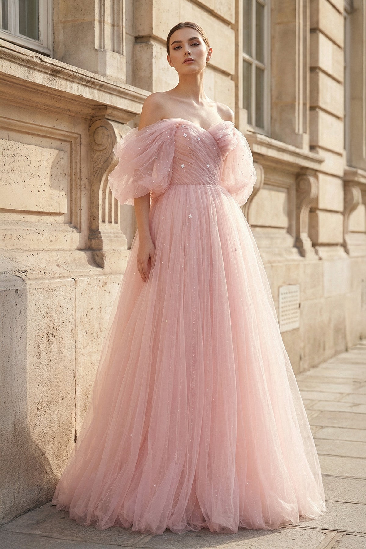 Make a graceful entrance with the Adalee Pink Tulle Floor Length Prom Dress. This charming A-Line dress is crafted from soft tulle and offers a dreamy and romantic silhouette perfect for prom or any special evening. Adalee dress is a perfect choice for both evening dresses and formal dresses, with its off-the-shoulder neckline adds a touch of elegance, highlighting your collarbone, while the pleated details create a whimsical texture that enhances the overall design.