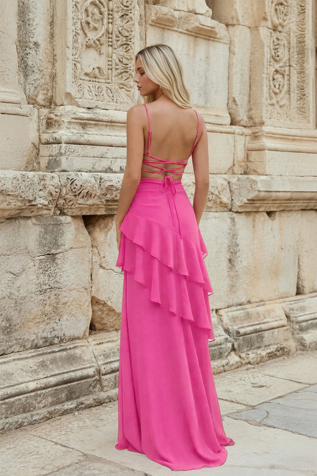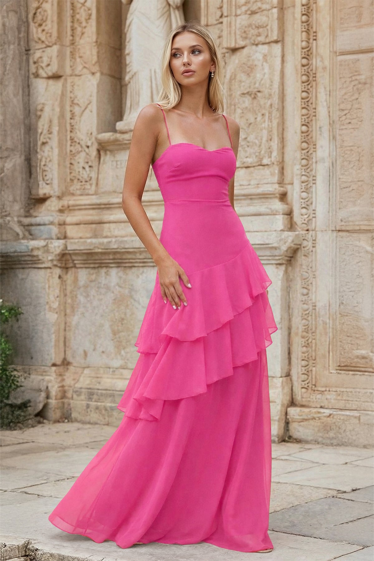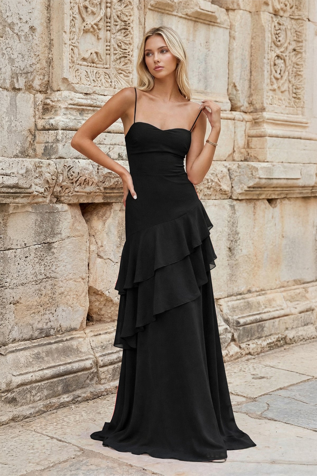 Chic and graceful, Posie is a refined piece from our evening dresses collection. Crafted in soft chiffon with a sleek sheath silhouette, she features delicate ruffles that add movement and charm. The slender spaghetti straps and lace-up back ensure a flattering and secure fit, while the floor-length design exudes under