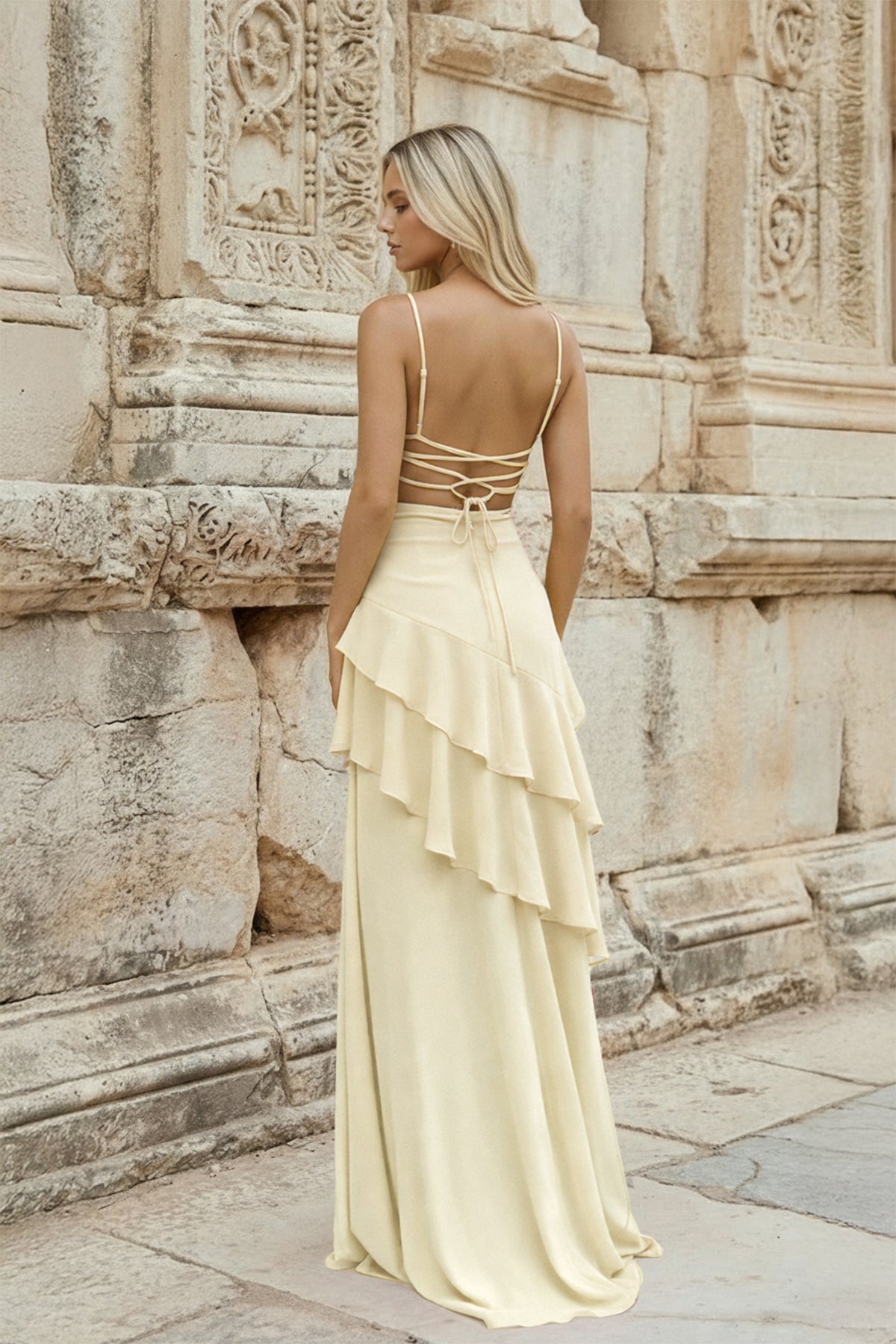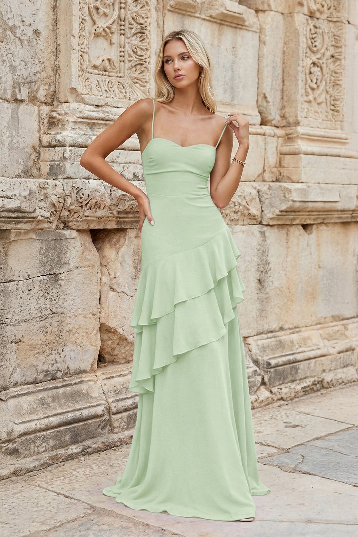 Chic and graceful, Posie is a refined piece from our evening dresses collection. Crafted in soft chiffon with a sleek sheath silhouette, she features delicate ruffles that add movement and charm. The slender spaghetti straps and lace-up back ensure a flattering and secure fit, while the floor-length design exudes understated elegance. Perfect for prom nights and formal celebrations, Posie stands out among formal dresses for her modern sophistication and feminine allure.