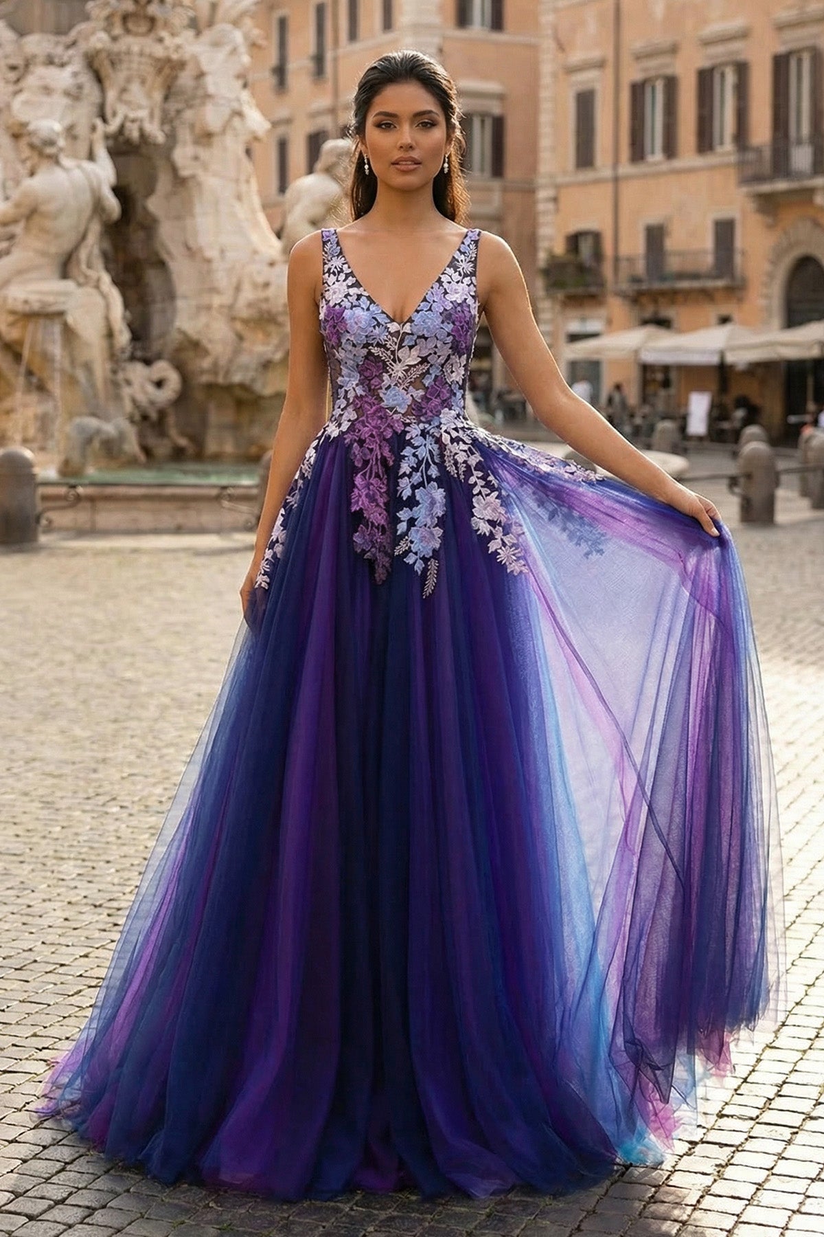 This elegant A-line prom dress features a flattering V-neckline and sleeveless silhouette crafted from luxurious purple tulle. Delicate appliqués adorn the bodice, while the open back design adds a touch of modern sophistication. The flowing skirt extends to a graceful sweep train, creating a dramatic entrance. Perfect for making an unforgettable statement at prom or formal events.