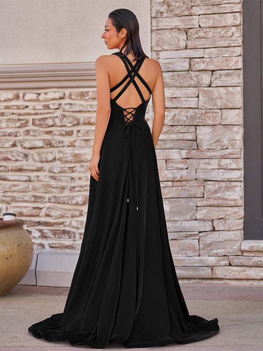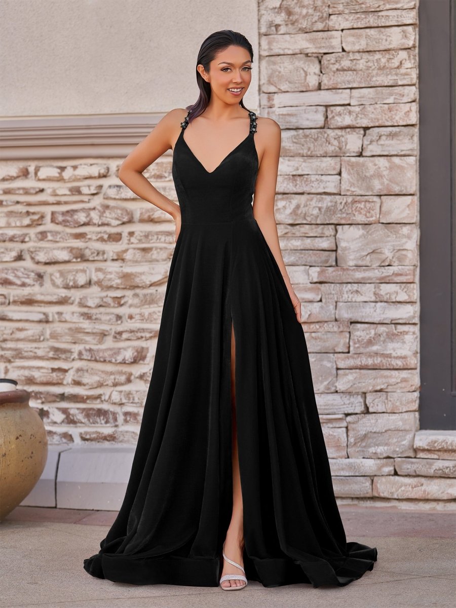 Discover Rylan, a stunning A-line dress crafted from luxurious red velvet. This timeless design features a deep V neckline, crisscross back, slit, and ruffles for a daring yet elegant look. Rylan is sure to turn heads, make it an ideal choice for both evening dresses and formal dresses, with its floor-length skirt and sweeping train for a dramatic entrance. Flattering for every figure, the A-line style provides grace and movement. Perfect for formal events, it is both comfortable and eye-catching. Make an impression with Rylan.