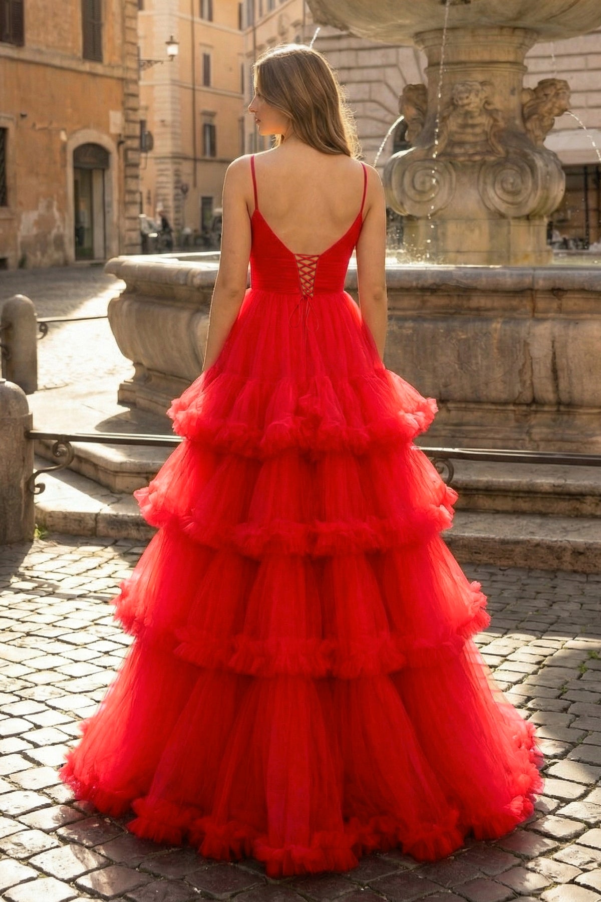 Elevate your style with Wrenlee, an exquisite A-line tulle prom dress that beautifully combines elegance with a playful twist. This masterpiece, available in striking red and aqua blue, features a flattering spaghetti-strap V neckline that accentuates the décolletage, providing a hint of allure. An ideal choice for both evening dresses and formal dresses, with its tiered, puffy ruffled skirt adding a whimsical charm, flowing gracefully to the floor, ensuring a spectacular entrance. The back is secured with a zipper, ensuring the dress fits impeccably, allowing freedom of movement. Wrenlee is the embodiment of modern sophistication and is designed to make you the center of attention at any event.