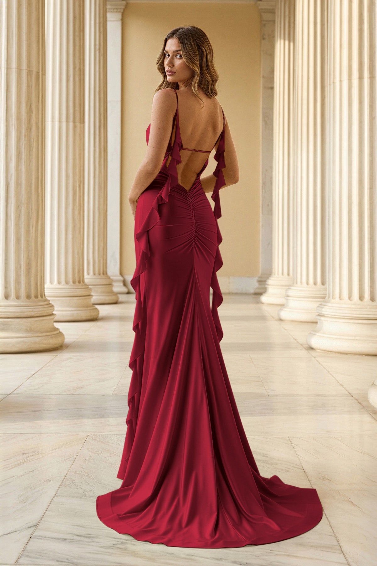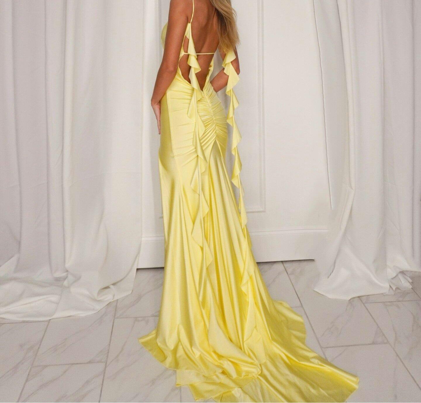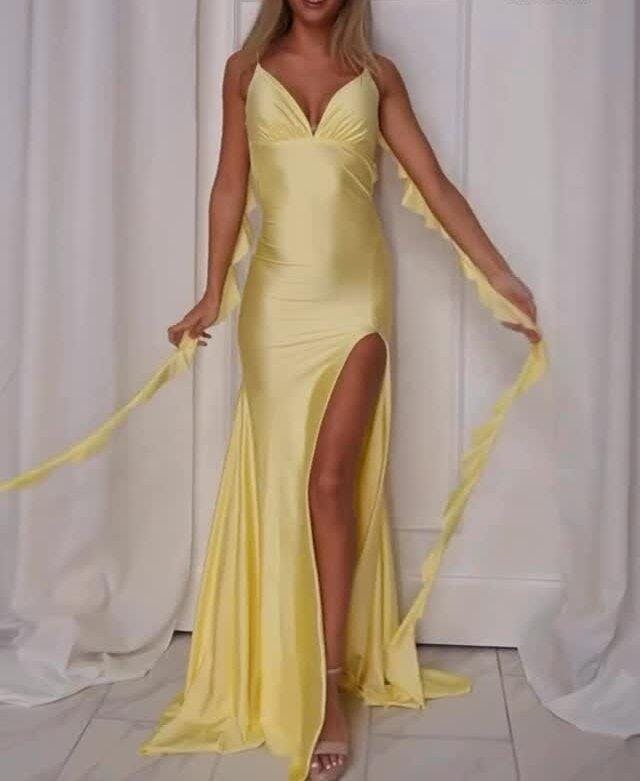 Bright, elegant, and effortlessly eye-catching, this yellow satin mermaid dress brings a fresh sense of glamour to a classic silhouette. Crafted from smooth satin, the gown skims the body beautifully before flaring into a graceful sweep train, creating fluid movement with every step. The V-neckline elongates the neckline and highlights the décolletage, while the sleeveless cut keeps the look sleek and modern. A bold backless design adds a hint of drama, balanced by soft ruffle details that introduce texture and romantic charm. Finished with a slit for ease of movement, this gown is a stunning choice for prom, formal evenings, or any occasion where confidence and elegance take center stage.