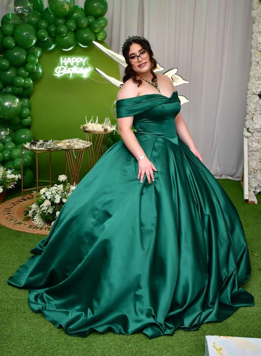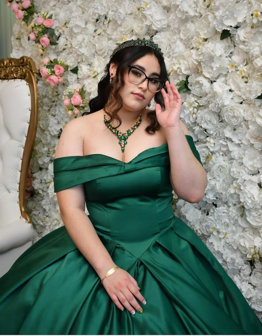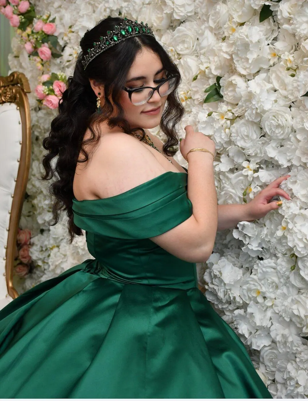 Embrace timeless sophistication with this Off-the-Shoulder Ball Gown Dark Green Satin Quinceanera Dress. This dress is crafted from luxurious satin fabric, the ball gown silhouette delivers regal elegance, while the off-the-shoulder neckline adds a romantic and graceful touch to your look. The intricately designed pleats flow seamlessly throughout the gown, adding depth and texture that enhances its luxurious appeal. The corset back offers a customized, secure fit, ensuring you feel both comfortable and radiant as you enjoy your special day. The rich dark green color is striking and unique, making this gown an ideal choice for those who want to stand out. Celebrate your quinceanera in a dress that exudes beauty, elegance, and poise.