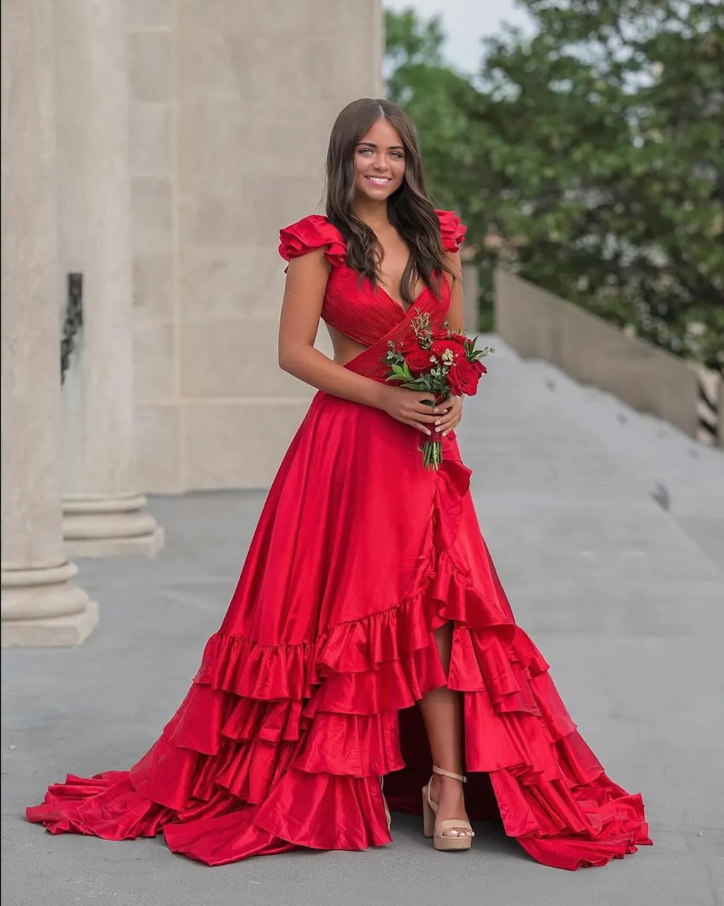 The Brittany gown is crafted from luxurious taffeta fabric, featuring an A-line design, a court train, and a lace-up back. Available in classic red, blue, and gold, this floor-length dress is perfect for both evening dresses and formal dresses, making it stunning for prom night or any special occasion. A V-neckline and sleeveless cut flatter the figure, while playful ruffles and a daring slit add dynamic movement. The Brittany gown is an embodiment of style, confidence, and timeless elegance, ensuring you make a memorable entrance at any event.