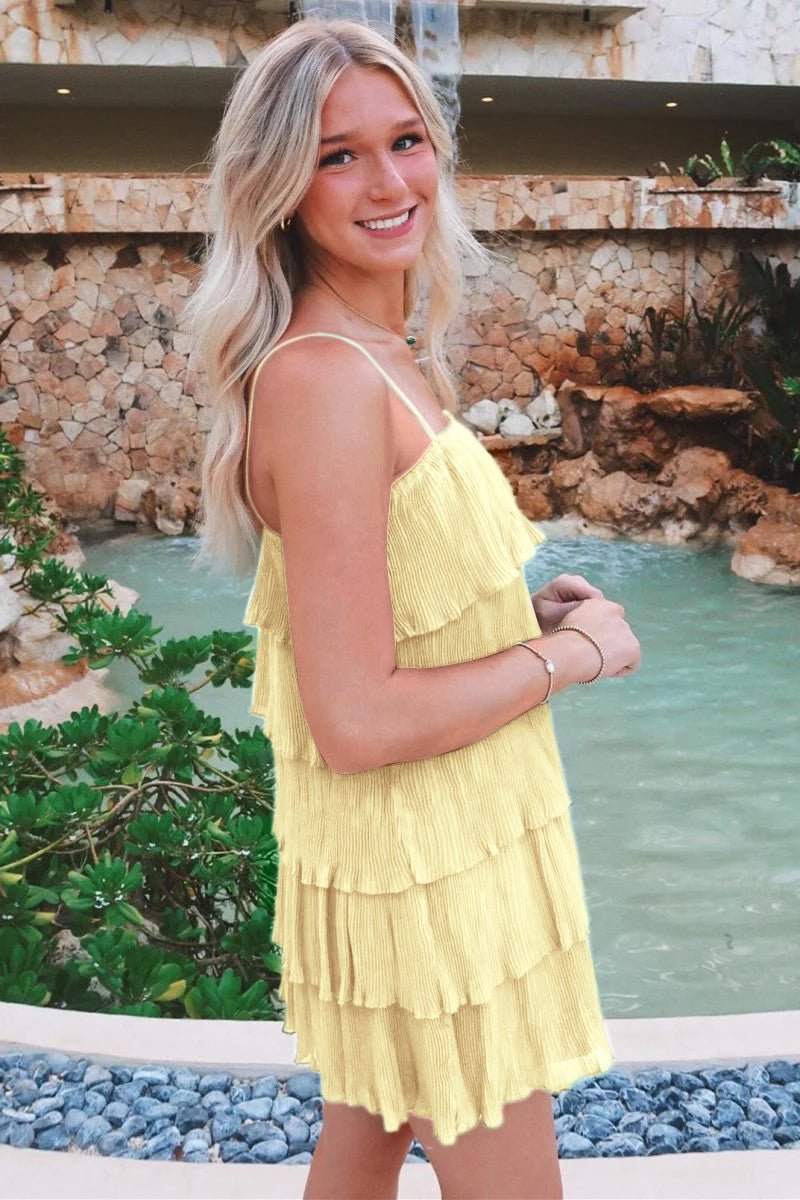 The Poppy Dress is your go-to choice for every special occasion. Designed in a flowing A-line silhouette with layers of soft chiffon, this dress features dreamy ruffled tiers and pleated details that create a playful and romantic vibe. The delicate spaghetti straps and flattering lace-up back provide both support and adjustability, while the lightweight fabric ensures comfort all night long. Whether you're headed to a party, homecoming, or a cocktail event, this short dress adds the perfect pop of style in stunning shades like green, lavender, champagne, and more.