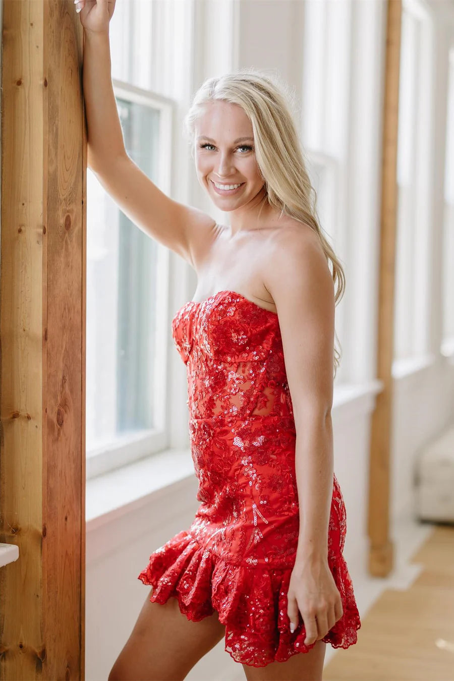 Step into the spotlight with this stunning strapless A-line mini dress. Crafted from delicate lace and available in lavender, navy blue, black, red, pink, and periwinkle, it features a flattering short-mini length that twirls beautifully with every step. The lace-up back ensures a perfect fit, while intricate appliqué and beading details add a touch of sparkle and sophistication. Ideal for homecoming, parties, or any special evening where you want to feel confident and effortlessly chic.