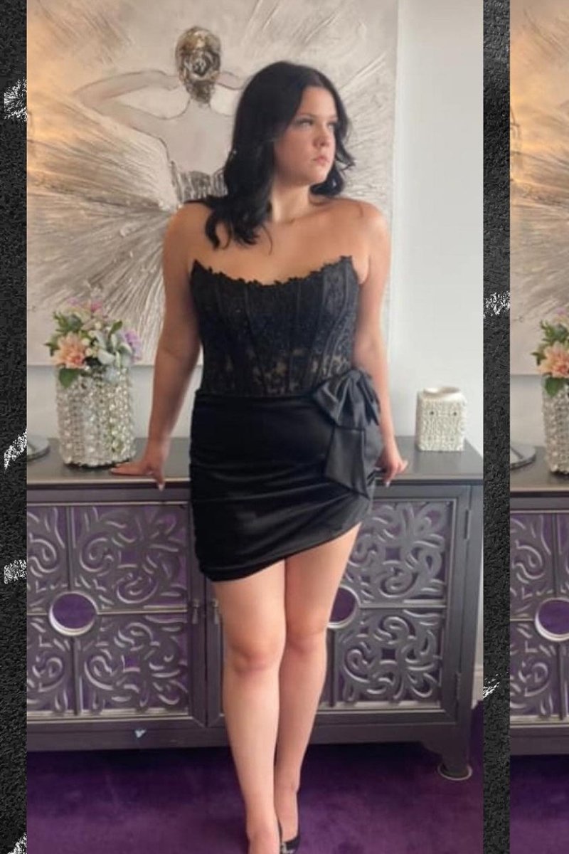 This chic sheath-style dress is made from delicate lace fabric and is available in red, black, and royal blue colors. The strapless neckline and applique embellishments add a touch of elegance to this dress, while the cute bow detail adds a playful touch. This dress is perfect for any special event and will make you the center of attention.