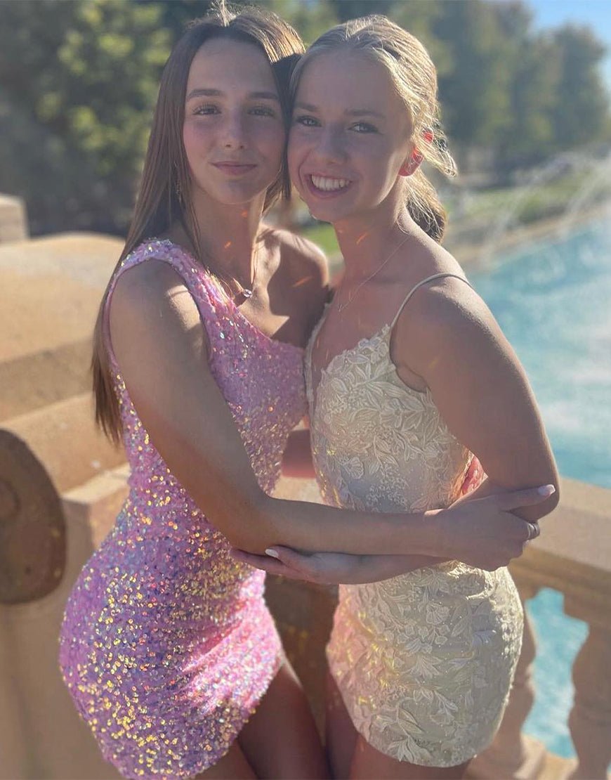 The Brielle homecoming dress is the epitome of elegance and charm. This short-mini sheath dress is uniquely designed with a lace top layer and sparkling tulle on the second layer, the combination of the two fabrics adds a level of depth and texture to the dress that is simply stunning, making it a showstopper for any special occasion. The Brielle dress features a captivating keyhole back, giving it a unique and appealing touch. This feature, combined with a sleek zipper, adds a sense of intrigue and sophistication that sets this dress apart from the rest.