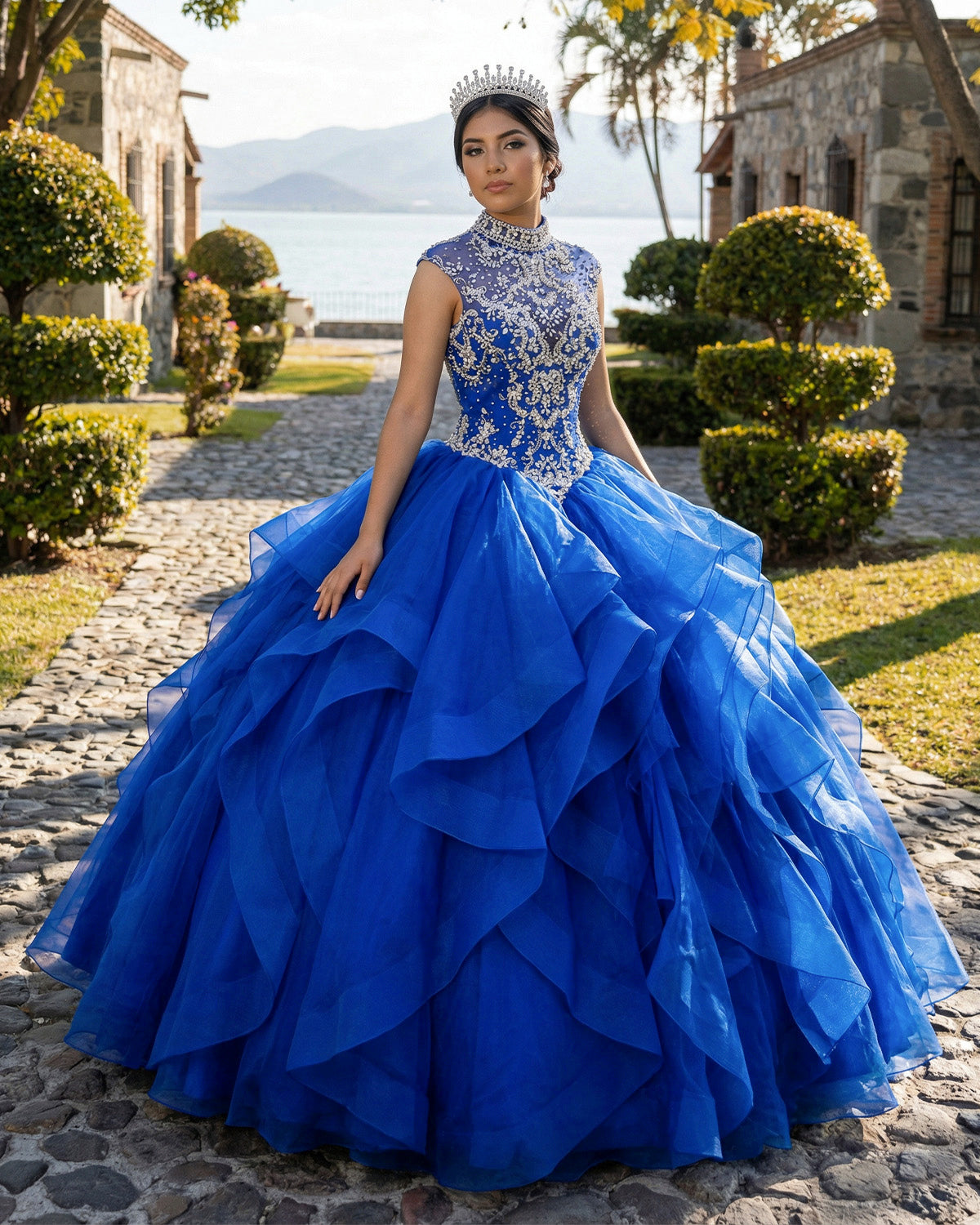 Exude elegance and grace on your Quinceanera or Prom day with this stunning ball gown. This dress is designed in a luxurious organza fabric. It is available in royal blue, red, or purple which offers a rich and vibrant color palette to match your personal style. The high neck neckline provides a regal and sophisticated touch, creating a structured and flattering silhouette that beautifully frames the face and shoulders. Adorned with intricate beading throughout, the gown catches the light with every step, ensuring you sparkle and shine all night long. The sleeveless design, combined with a lace-up back, provides a comfortable and customizable fit, allowing you to feel confident and beautiful on your special occasion.