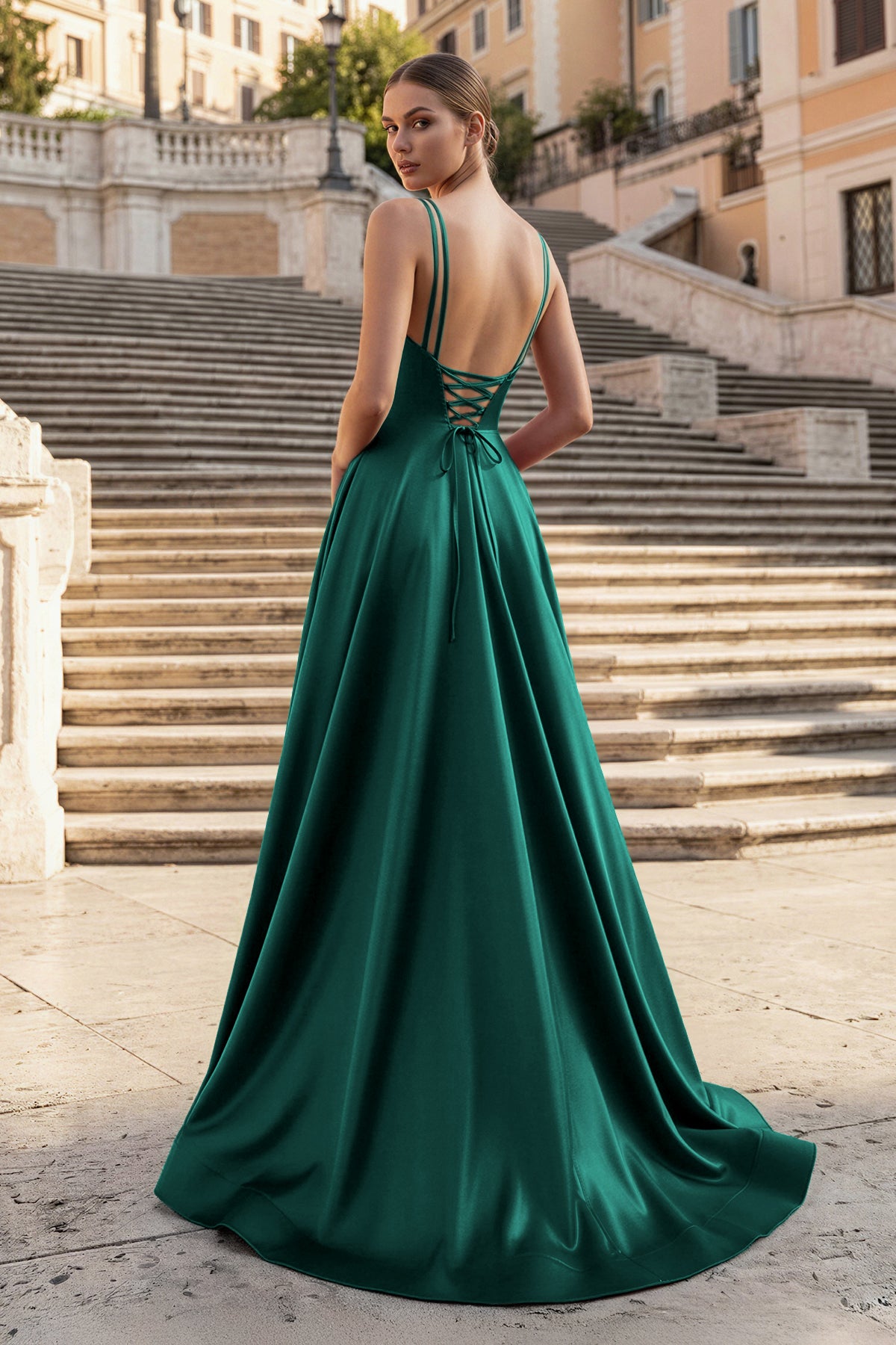 Rich in color and timeless in design, this burgundy satin A-line dress offers an elegant balance of sophistication and allure. The smooth satin fabric drapes beautifully from the waist, flowing into a graceful sweep train that creates effortless movement and a flattering silhouette. The V-neckline elongates the neckline, while the sleeveless design keeps the look clean and refined. A subtle slit adds a modern touch and allows for ease of movement. Finished with a lace-up back for a secure, adjustable fit, this dress is a stunning choice for prom, formal evenings, or any occasion where classic beauty and confidence shine.