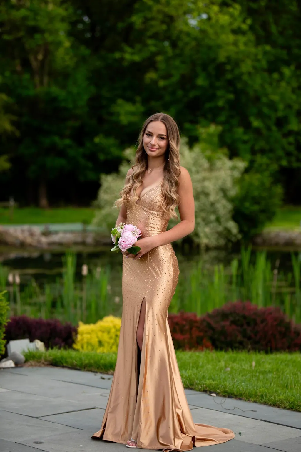 Turn heads in this Sexy Mermaid V Neck Gold Satin Slit Prom Dress, a dazzling choice for those who want to make a statement. Crafted from luxurious satin, this dress hugs the body with a figure-flattering mermaid silhouette, sculpting your curves for a glamorous, show-stopping look. The rich gold color radiates sophistication and warmth, ensuring you shine brightly on any special occasion. The plunging V-neckline adds a bold and elegant touch, while the daring slit along the side offers a modern, seductive edge, allowing you to move freely and confidently. The lace-up back provides a customized fit, ensuring comfort and support throughout the evening. Whether you're walking the red carpet or dancing the night away, this floor-length dress is a stunning choice for evening dresses and formal dresses.