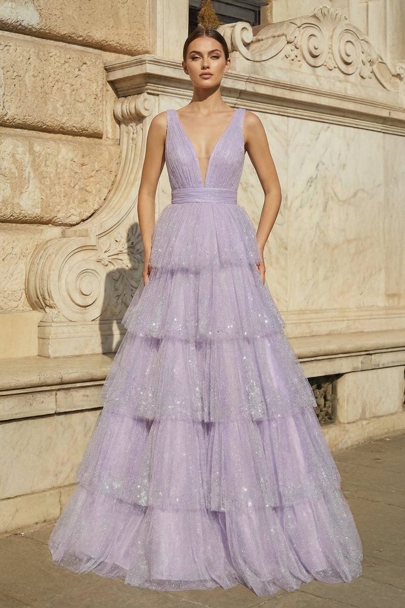 Step into the spotlight with the Lavender Tulle Sequin V-Neck Ruffle Tiered Long Prom Dress. This enchanting A-line dress showcases a flattering V-neckline that beautifully frames the face and neckline. It is crafted from ethereal tulle and features cascading ruffles that add a playful touch and a sense of movement to every step. A fabulous selection for both evening dresses and formal dresses, with its luxurious sequined embellishments catch the light, creating a dazzling effect as you dance the night away. This dress is available in stunning shades of lavender, fuchsia, sky blue, and black, with a lace-up back for a personalized fit, you’ll be ready for an unforgettable evening filled with style and grace.
