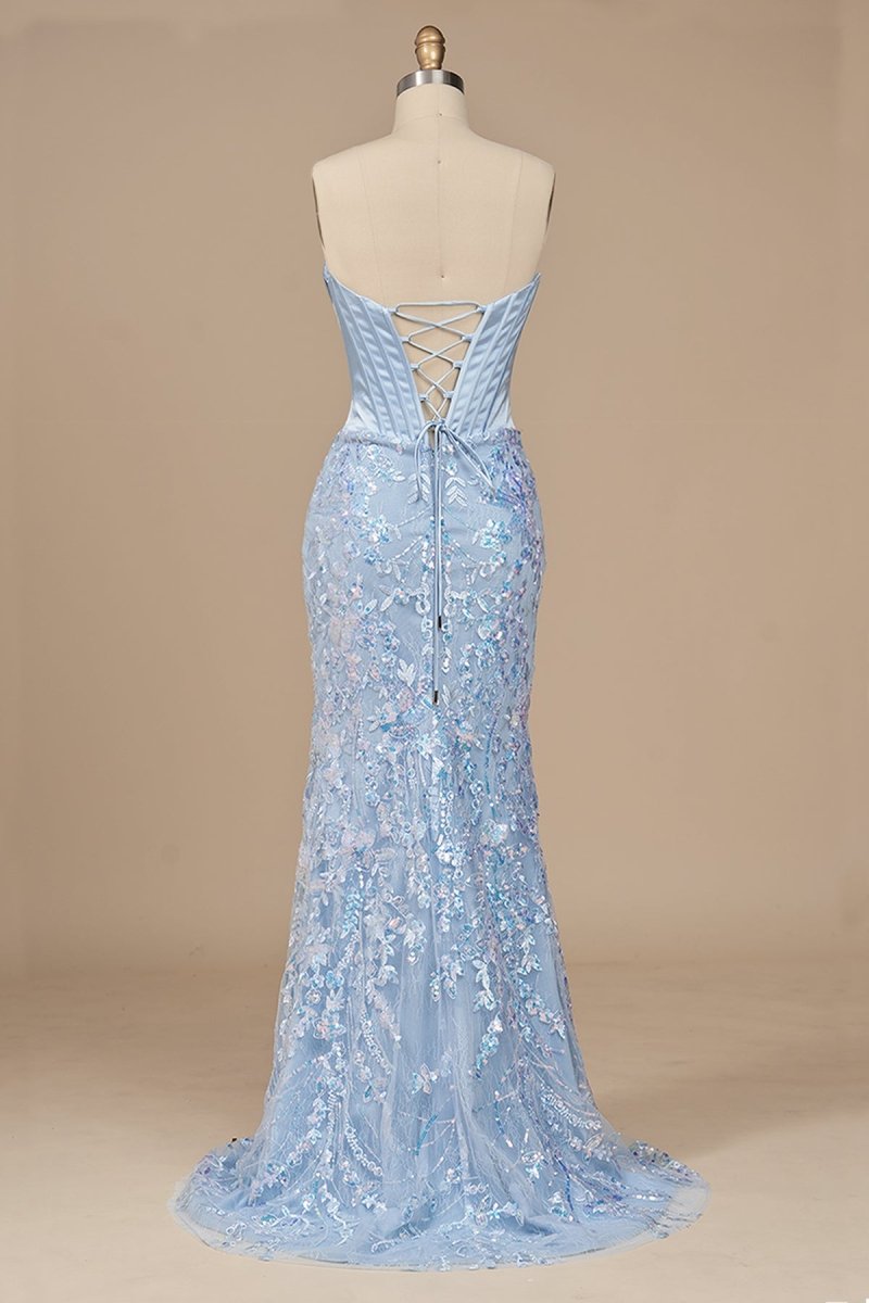 Seliya arrives with an air of dreamy sophistication in our line of evening dresses. Her lace mermaid silhouette is delicately sculpted, wrapping the figure in gentle texture while shimmering sequins catch the light with every step. The strapless neckline opens the shoulders gracefully, leading into a fitted bodice that flows into a dramatic skirt and subtle sweep train. A bold slit adds movement and allure, while the lace-up back completes her look with romantic refinement. Among our formal dresses, Seliya is the picture of elegance—serene, sparkling, and effortlessly captivating.