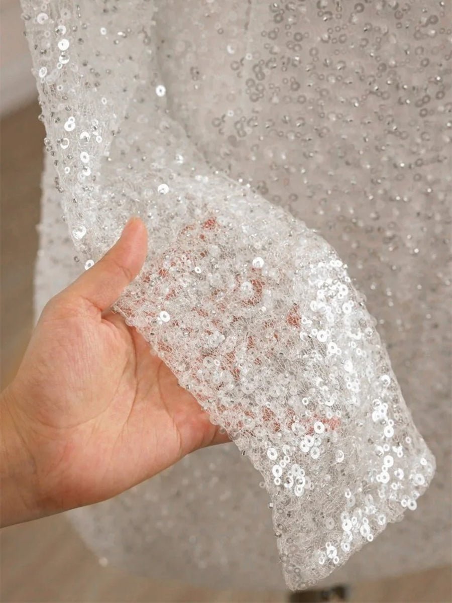 The Aelia wedding dress is the perfect choice for the bold and fashion-forward bride. This chic short mini dress is crafted from luxurious lace fabric and adorned with shimmering sequins that catch the light with every movement, adding an element of sparkle and glamour to your special day. The strapless neckline creates a sleek, timeless look that highlights the shoulders and neckline, while the backless design brings a touch of daring sensuality to the overall look. The long detachable sleeves offer versatility, allowing you to transform your look throughout the day. Whether you choose to wear the sleeves for a more dramatic, elegant feel during the ceremony or remove them for a carefree and contemporary vibe at the reception, the Aelia dress has the perfect balance of style and flexibility.