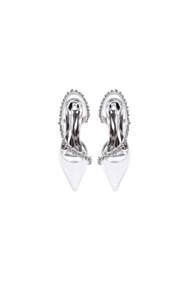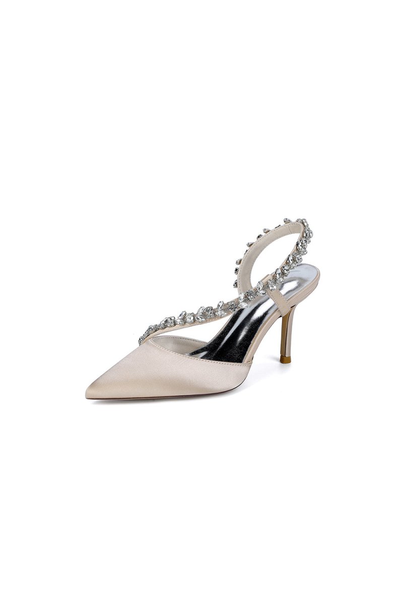 Transform your look with these exquisite white satin high heels, embodying the epitome of elegance and sophistication. Featuring a sleek pointed toe and slender high heel, these shoes exude refinement and style. Crafted from smooth satin material, they offer a timeless matte finish for a classic touch. The focal point of these high heels is the intricate chain of crystal embellishments adorning the vamp, catching the light and creating a dazzling effect that demands attention. The transparent lace-up detail adds a touch of modernity, while the pristine white background allows the shoes to shine and display their exquisite craftsmanship. Elevate your style for any occasion with these luxurious white satin high heels embellished with crystals, perfect for formal events or adding a touch of opulence to your everyday wear.