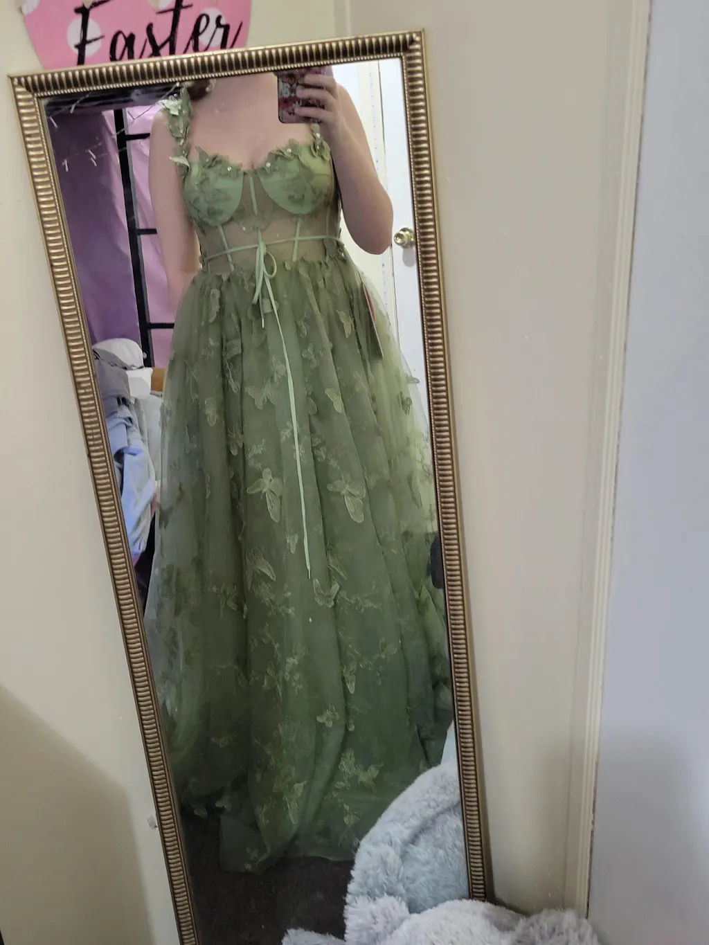 - Embellishment: Embroidered 3D Butterflies & Sash