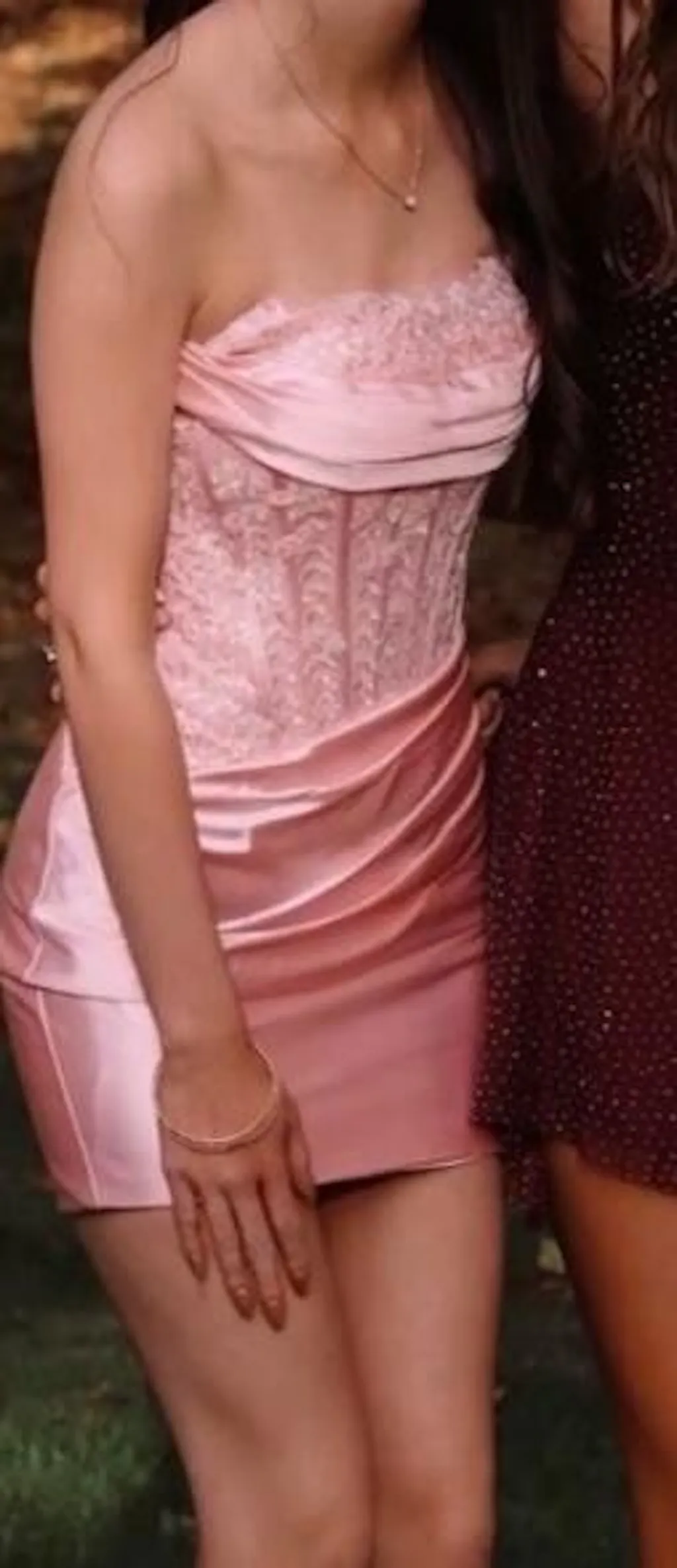 Designed in a figure-hugging bodycon silhouette, this strapless satin mini homecoming dress in a dreamy pink features elegant pleating and shimmering beaded accents that add just the right touch of sparkle. Finished with a lace-up back for a tailored fit, this dress is the perfect balance of structure and softness. Whether you're dressing up for homecoming, attending a stylish cocktail event, or dancing the night away at a party, Delmira is the statement-making piece that ensures all eyes are on you.