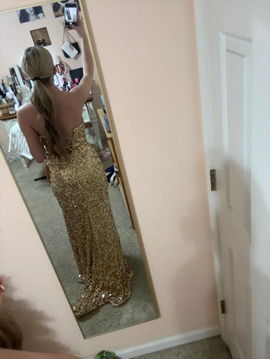 Make a dazzling entrance in the Sparkly Golden Sheath Prom Dress. This stunning dress is available in a spectrum of vibrant colors including gold, fuchsia, black, green, navy blue, orange, red, and royal blue, and features a chic mermaid silhouette that hugs your curves beautifully. The strapless neckline and sleeveless design offer a modern touch, while the intricate sequins shimmer with every movement. A daring slit adds an element of surprise, and the lace-up back ensures a customized fit. Whether you’re dancing the night away or making memories, this dress is your ultimate companion for a night of glamour.